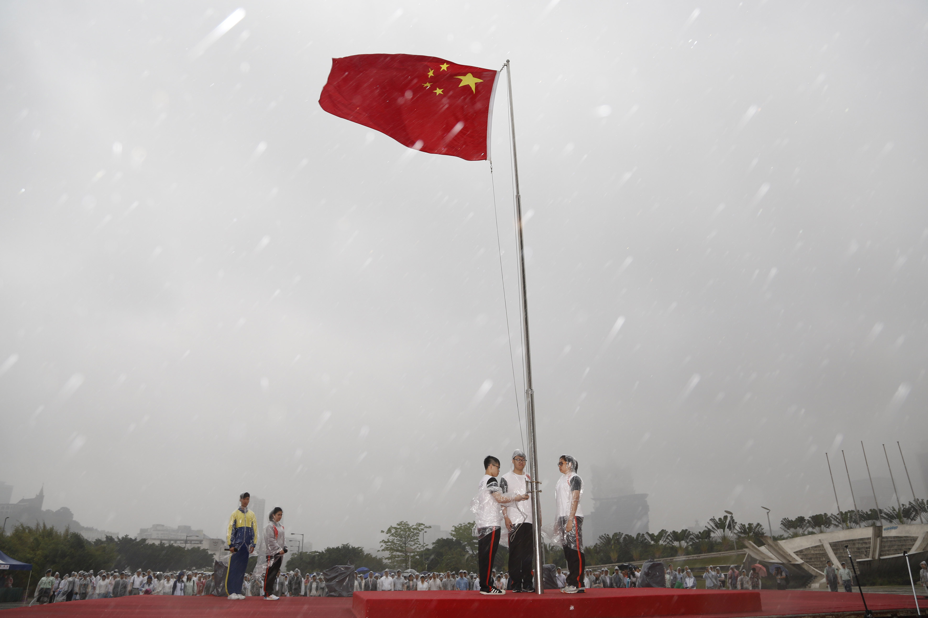升旗儀式原安排了教業中學管樂團演奏樂曲、嶺南中學學生表演中國武術、“2014五四青年民族文化週”的民族代表演唱愛國歌曲,以及“五四精神有感而發”感想撰寫活動頒獎等項目,由於天雨取消。
