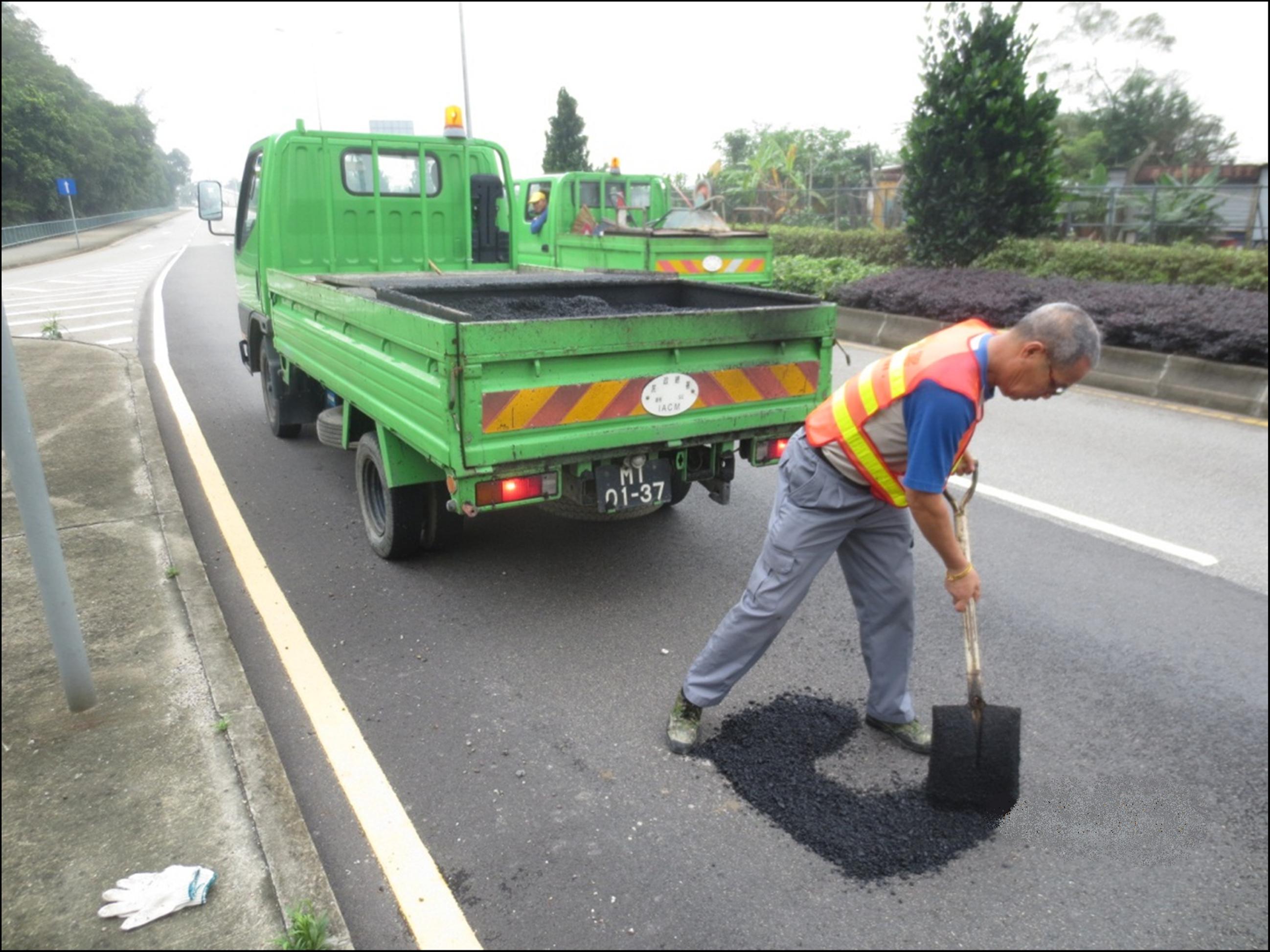 經常承受大型車輛行駛的瀝青路,容易引致路面出現裂縫及坑洞,加上部份車輛若有漏油情況,更會令瀝青路面失去黏結能力而變得鬆散。近日持續暴雨,雨水沖刷及車輛不停輾壓後,令路面加速損毀。民政總署已啟動緊急處理機制,對受損路面進行搶修,對於未能即時修復的位置會加設鐵板等臨時措施,減低意外風險,待天氣轉好時將按其對市民造成的影響及危險性,以先後緩急進行全面修補工程。