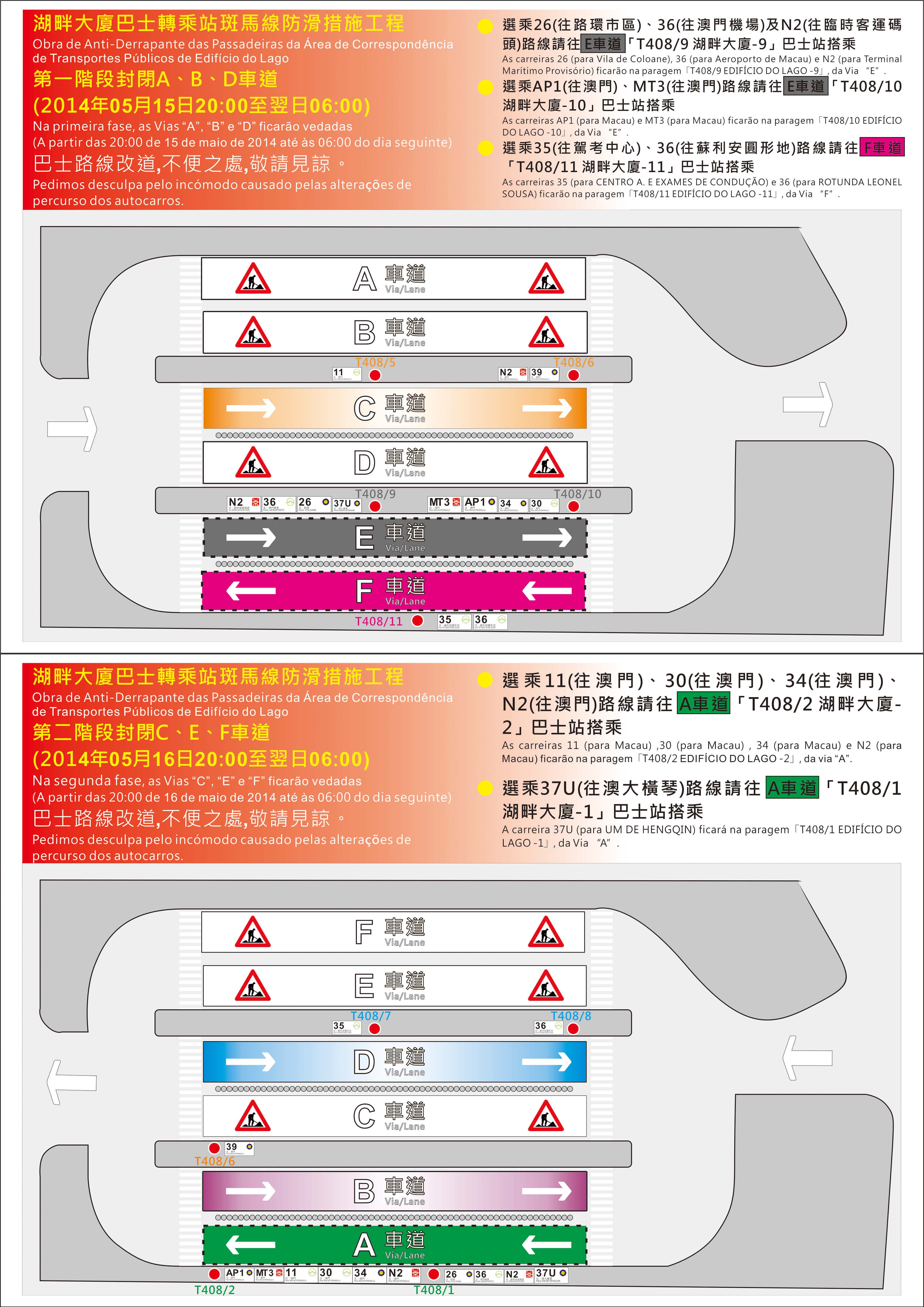 相關工程將於本月15、16日(周四、周五)每日晚上8時至翌日早上6時進行,配合上述工程,湖畔大廈巴士站A、B及D車道於本月15日晚上8時至翌日早上6時封閉,屆時,26、36、N2(往機場)、AP1及MT3(往澳門)會由A車輛臨時改往E車道靠站,35(往駕考中心)及36(往蘇利安圓形地)則由D車道改往F車道靠站;而本月16日晚上8時至翌早上6時則封閉C、E及F車道,期間,37U(往澳大橫琴)、30及34(往北區)會由E車道臨時調往A車道靠站,11及N2(往亞馬喇)則由C車道改為停靠A車道。
