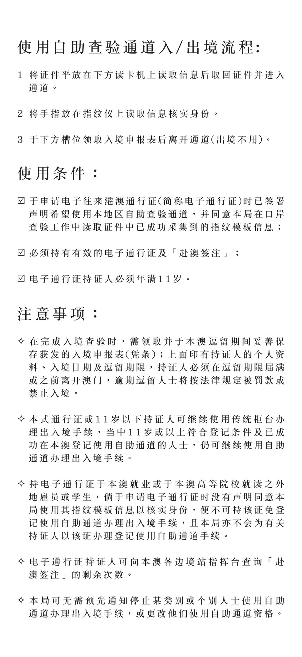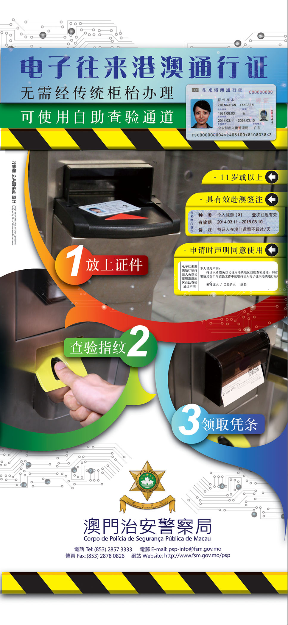 內地居民於申辦電子通行證時, 授權同意澳門治安警察局使用其指紋模板信息,便可直接使用於澳門各口岸自助查驗通道進出境,治安警察局將採取相應措施,配合電子通行證之使用,包括制訂適當指引、優化自助查驗通道及培訓人員,亦會密切留意電子通行證之使用情況,做好通關工作。