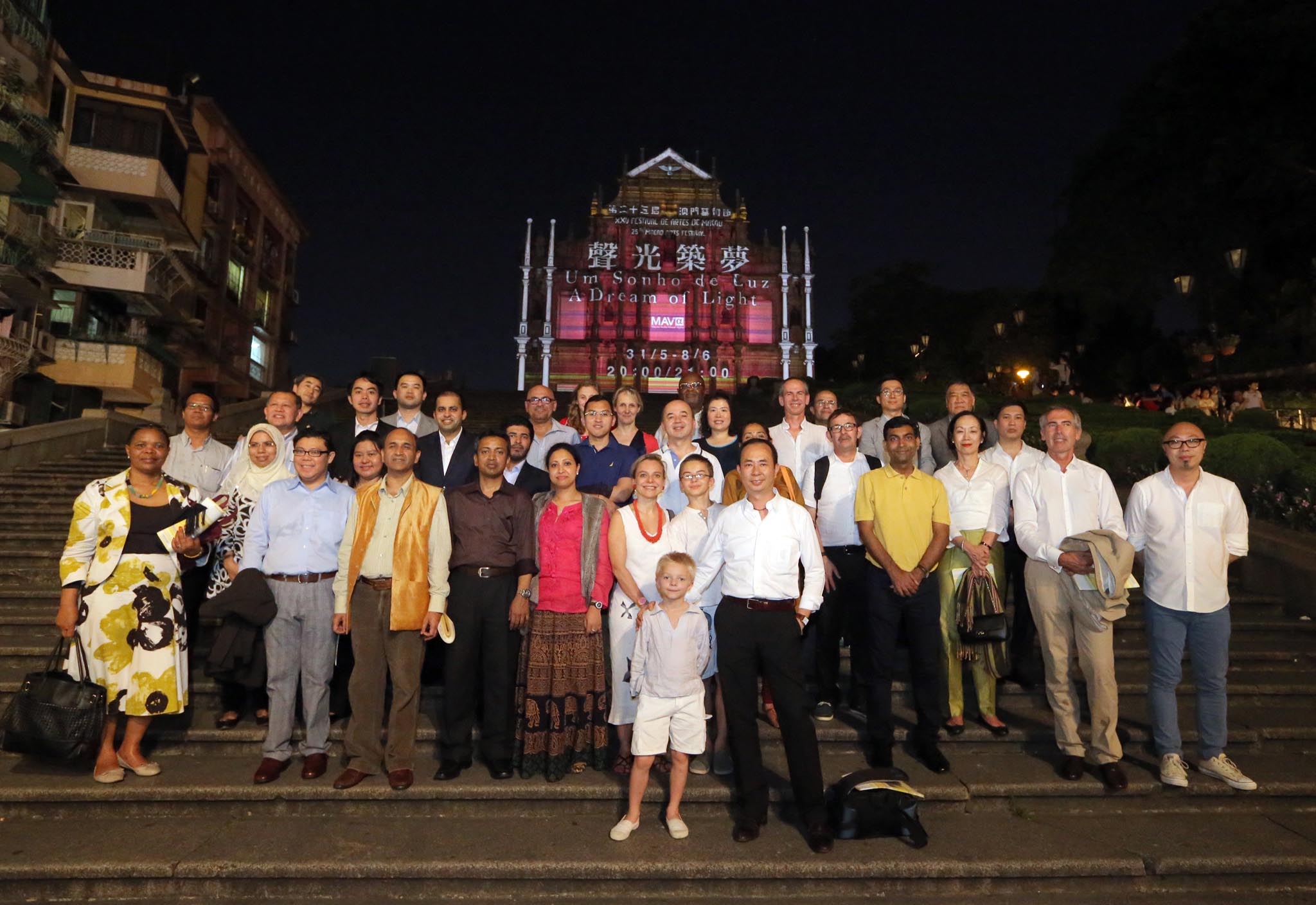 領事團在北帝廟前地搭起的半穹頂放映室內欣賞藝術節《穹頂之舞》演出,觀賞了該節目以環迴影像效果呈獻的跨越舞蹈、數碼特技及影像的短片《美》和《伴》,動感澎湃、刺激震撼;隨後文化局設宴招待領事團,並邀請創作本屆銀禧藝術節壓軸鉅獻《聲光築夢》的MAVA影音藝術團主要代表參與晚宴,向領事團分享創作理念及設計解構,讓來自不同國家的領事們對節目內出現的符號形象等有進一步了解。領事團於晚宴後前往大三巴牌坊觀賞《聲光築夢》,節目透過光影藝術與建築共舞,將大三巴牌坊變成畫布,展示結合光、影、聲的精彩演出,讓觀眾體現澳門的多元文化及人文氣息,領事們均盡興是次藝術節的文化活動之旅。