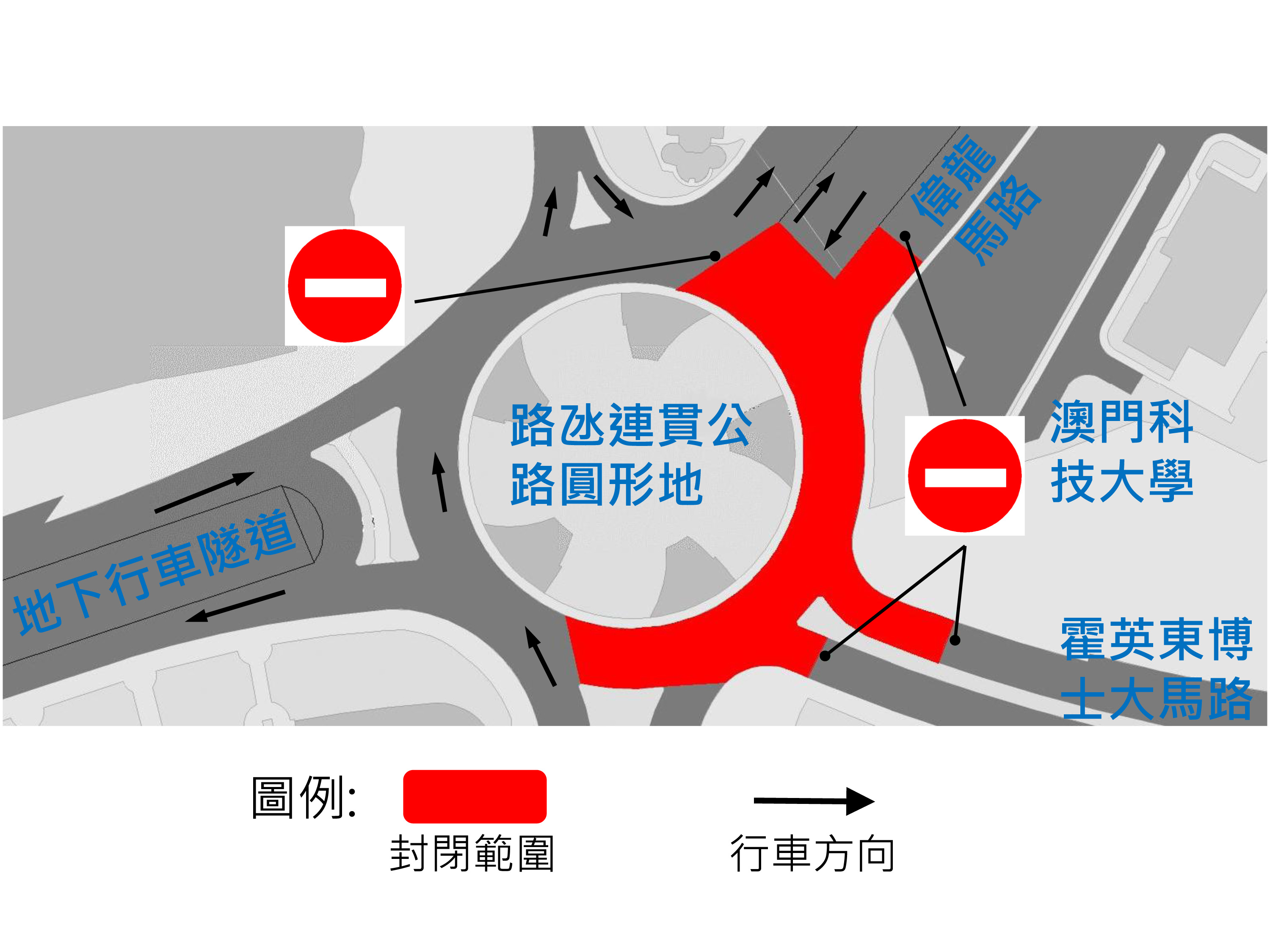 建設發展辦公室繼續推進路氹連貫公路圓形地行人天橋之工作,路氹連貫公路圓形地近偉龍馬路的路段、由澳門科技大學往路氹連貫公路圓形地的一段偉龍馬路及霍英東博士大馬路近路氹連貫公路圓形地的路段將於周六(14日)至周一(16日)每日凌晨0時至清晨6時封閉交通,呼籲駕駛者留意。