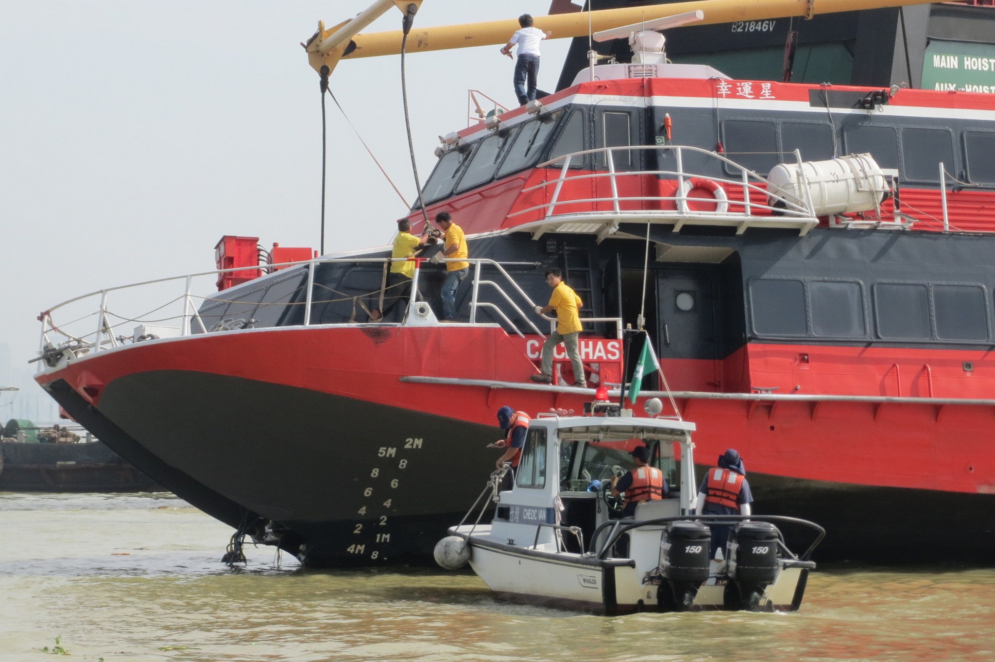 由於發生意外的客船擱淺在外港航道的南防波堤船,為免對其它客船的航行構成影響,海事及水務局要求船公司儘快移走肇事客船,並與客船公司於昨日提早部署了起吊作業和相關應對方案。為配合和監督客船的起吊工作,以及保障周邊船隻的航行安全,海事及水務局和海關今日早上派出了多艘船隻前往現場戒備和協助。