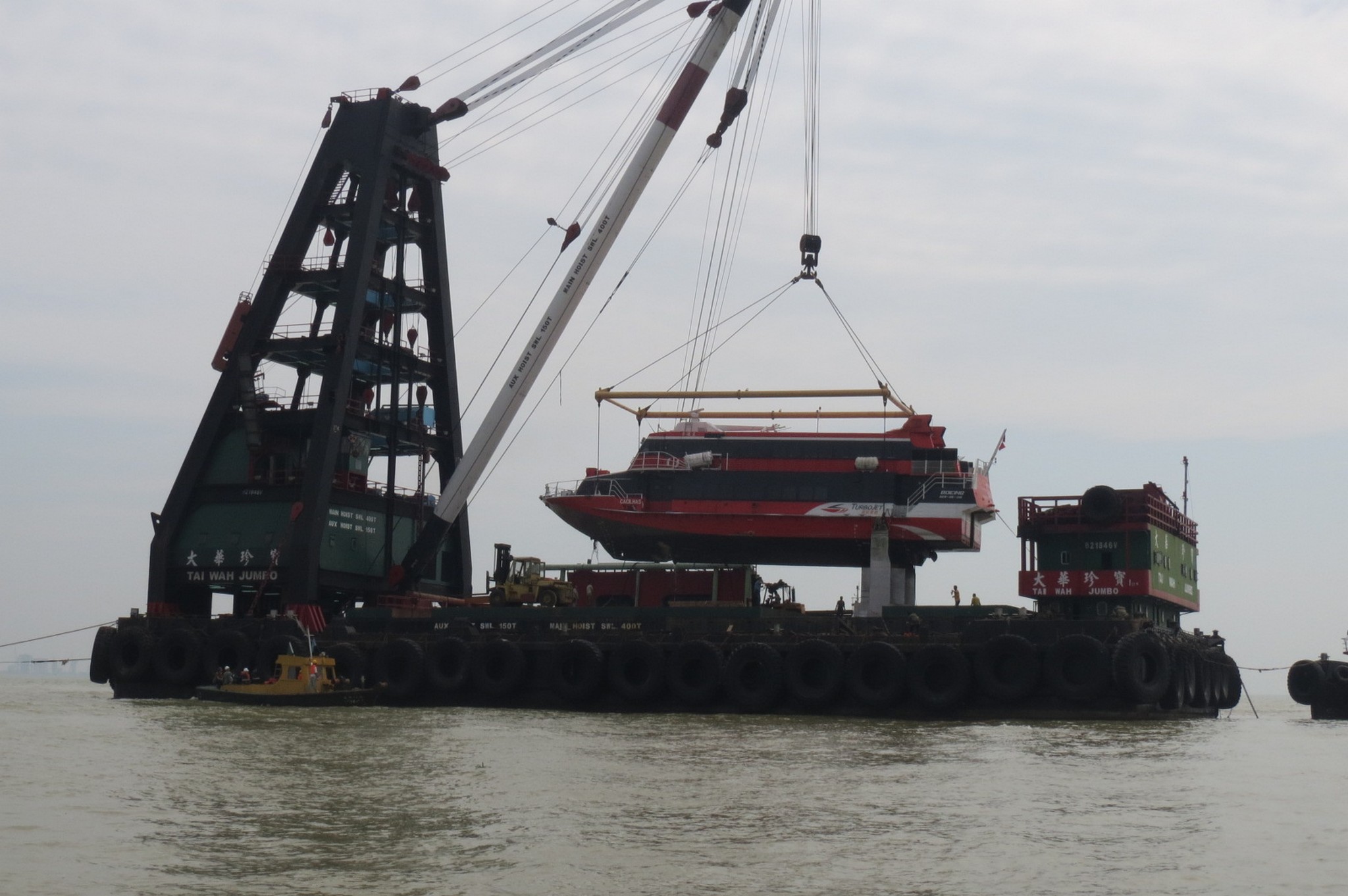 起吊船隊約於今日早上8時15分到達作業位置,經現場評估天氣、海況、海水潮位和水深條件等因素,以及與海事及水務局和海關人員商議後,認為具備條件進行起吊工作。起吊船隊隨即於8時30分開始作業,首先放下吊架,並讓工作人員登上客船,在船艏和船艉綁上多條鋼索,固定船身與吊架。完成固定工作後,船隊約於9時40分成功吊起肇事客船,並把客船放置在船隊的躉船上,以便把客船運回香港的船廠作跟進處理。整個起吊作業的過程順利,歷時約1小時15分鐘。