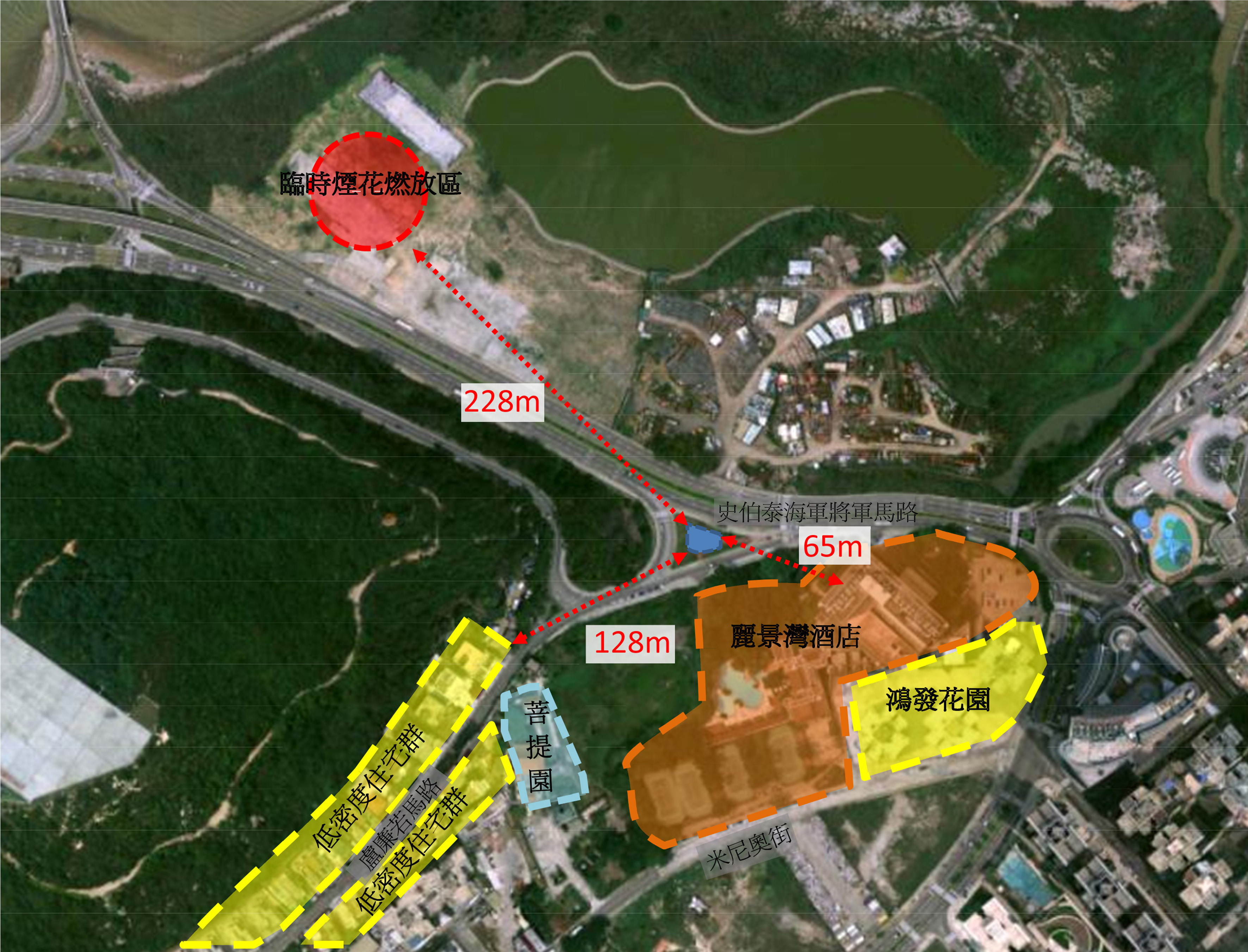 鑒於選址鄰近民政總署於春節期間設置的氹仔臨時爆竹煙花燃放區,特區政府很重視此方面的安全性。由於該燃放區為臨時性質,有關場地的具體範圍和場區佈局,由相關部門根據當時實際需要及情況研究及協調而定,包括對人流的預測以及考慮周圍城市環境的改變等因素,以確保符合相關法例的要求。