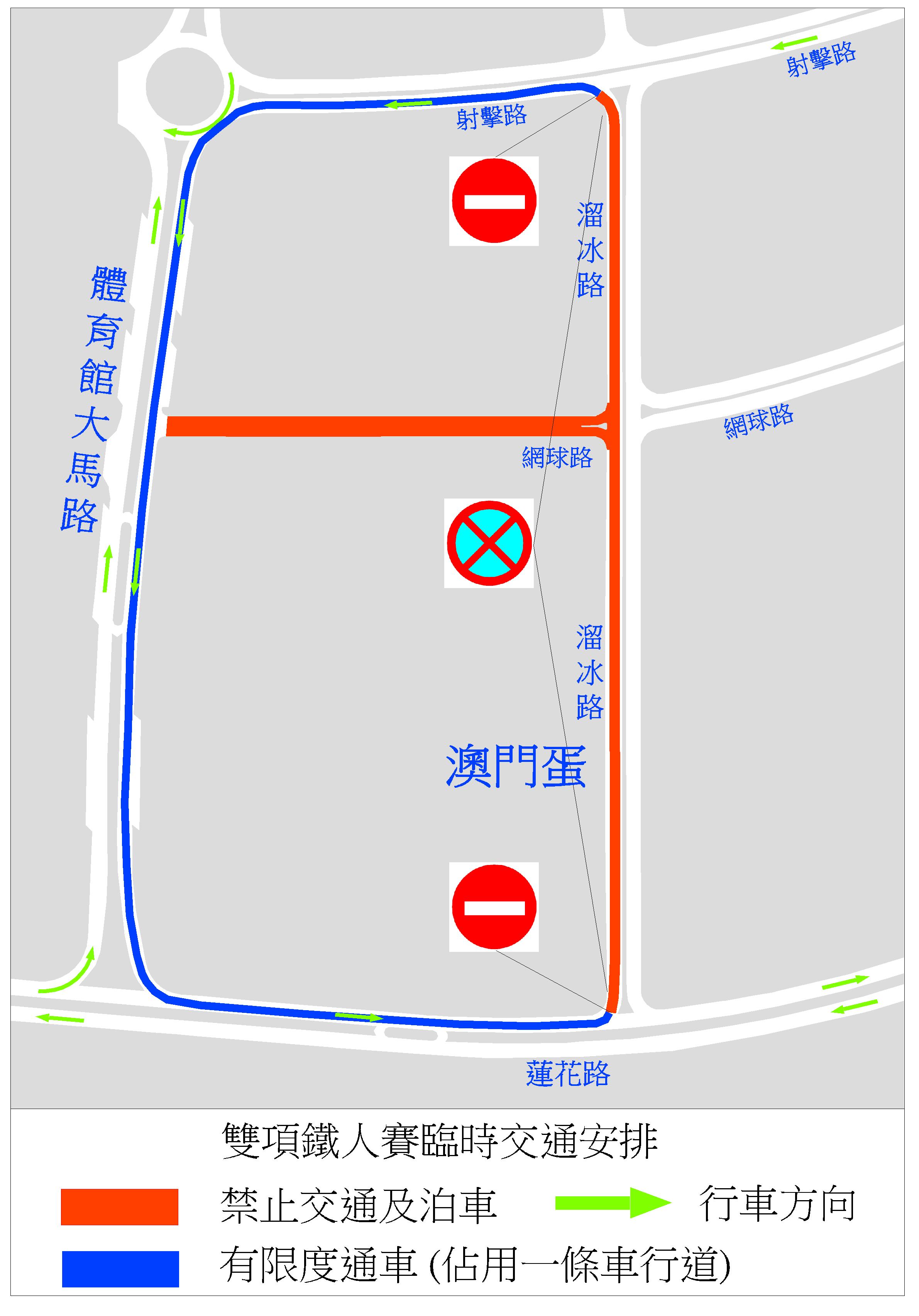體育發展局將於本月22日(周日)舉行鐵人賽,因應賽事需要,介乎蓮花路與射擊路之間一段溜冰路由蓮花路往射擊路方向,即靠向澳門東亞運動會體育館的一側車行道,以及介乎體育館大馬路與溜冰路之間一段網球路於當日上午7時30分至10時30分封閉交通,體育館大馬路、蓮花路及射擊路則有限度通車。