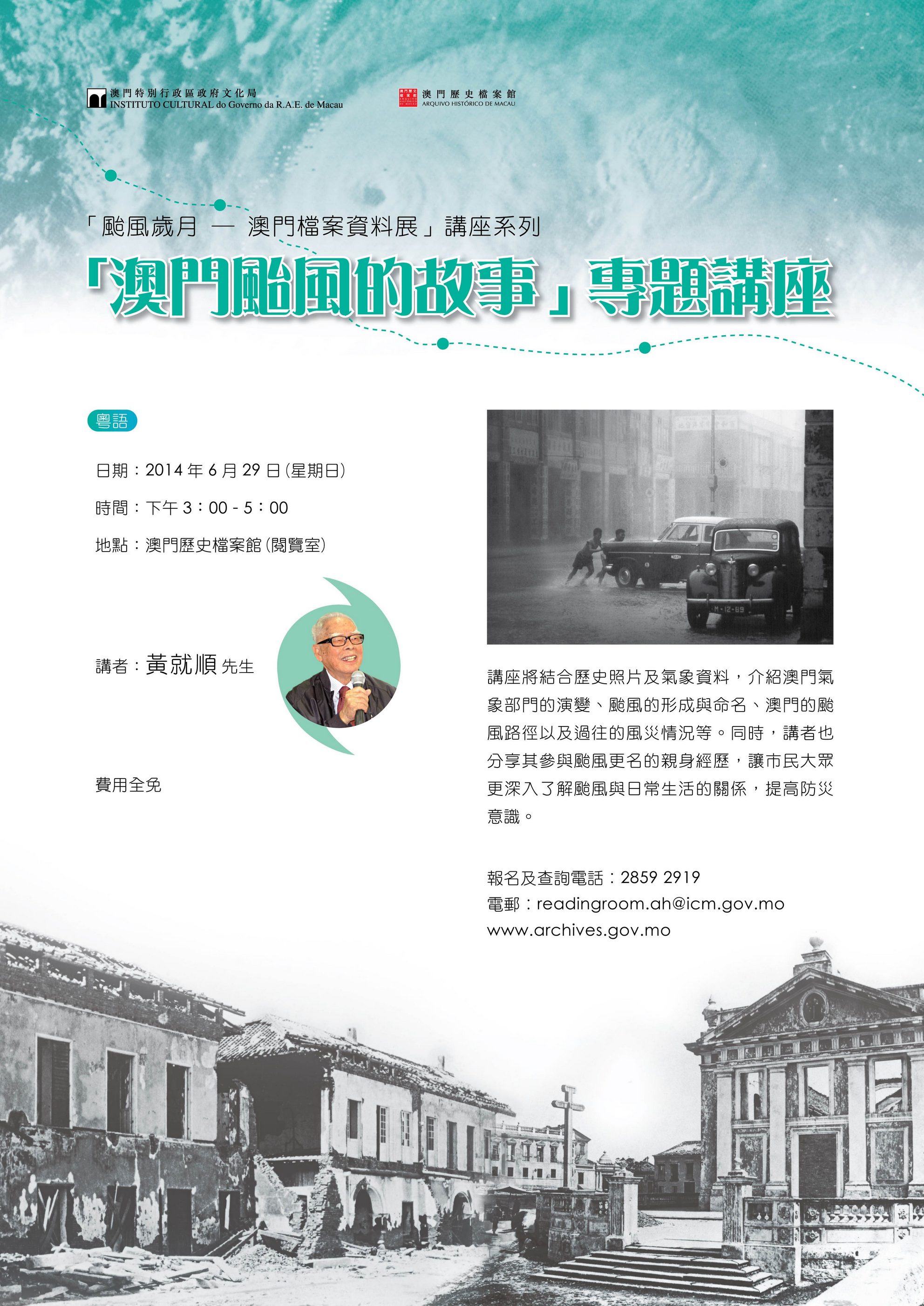 文化局澳門歷史檔案館為配合《颱風歲月──澳門檔案資料展》,將於六月廿九日(星期日)下午三時至五時,在塔石廣場歷史檔案館閱覽室舉辦“澳門颱風的故事”專題講座,歡迎市民參與。