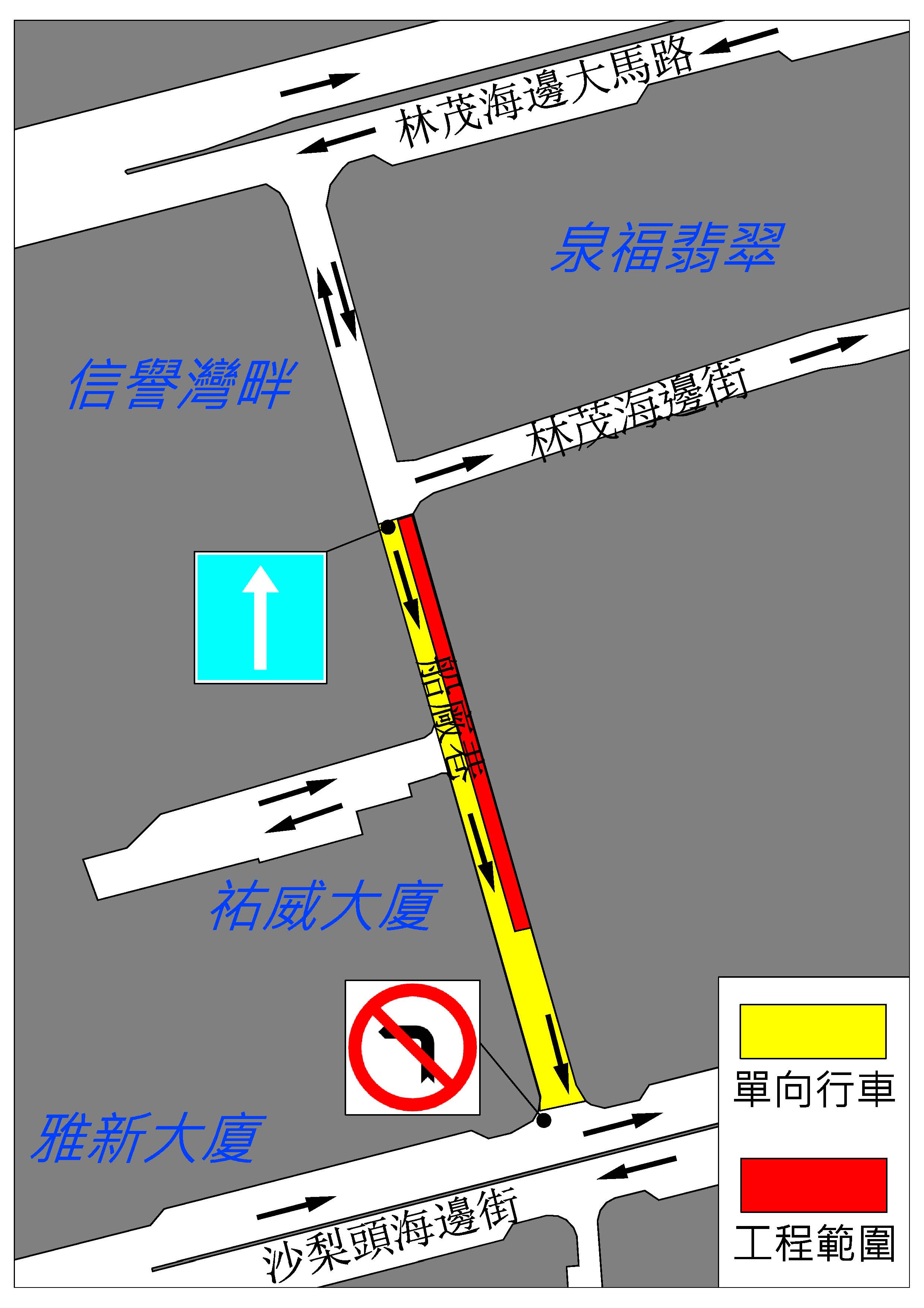 因鋪設電訊管道,介乎林茂海邊街與沙梨頭海邊街之間的一段船廠巷,於本月10日(周四)上午10時起臨時改作單向行車,即車輛只可由林茂海邊街往沙梨頭海邊街方向行駛。工期約20日。