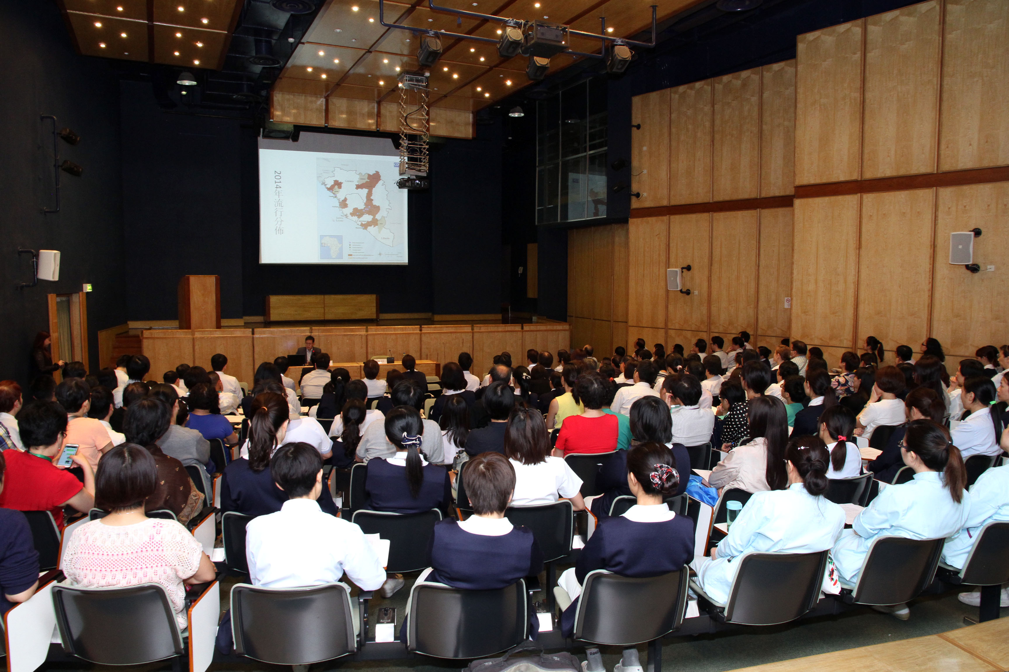 埃博拉(伊波拉)病毒病在西非幾內亞、利比里亞和塞拉里昂三國爆發,且不斷蔓延。為做好各項防疫準備工作,衛生局今明兩日為業界舉辦“預防埃博拉(伊波拉)病毒病講解會”,講解流行情況、通報、送檢流程、感染控制及防控措施,首場講解會逾二百名衛生局醫務人員參與。