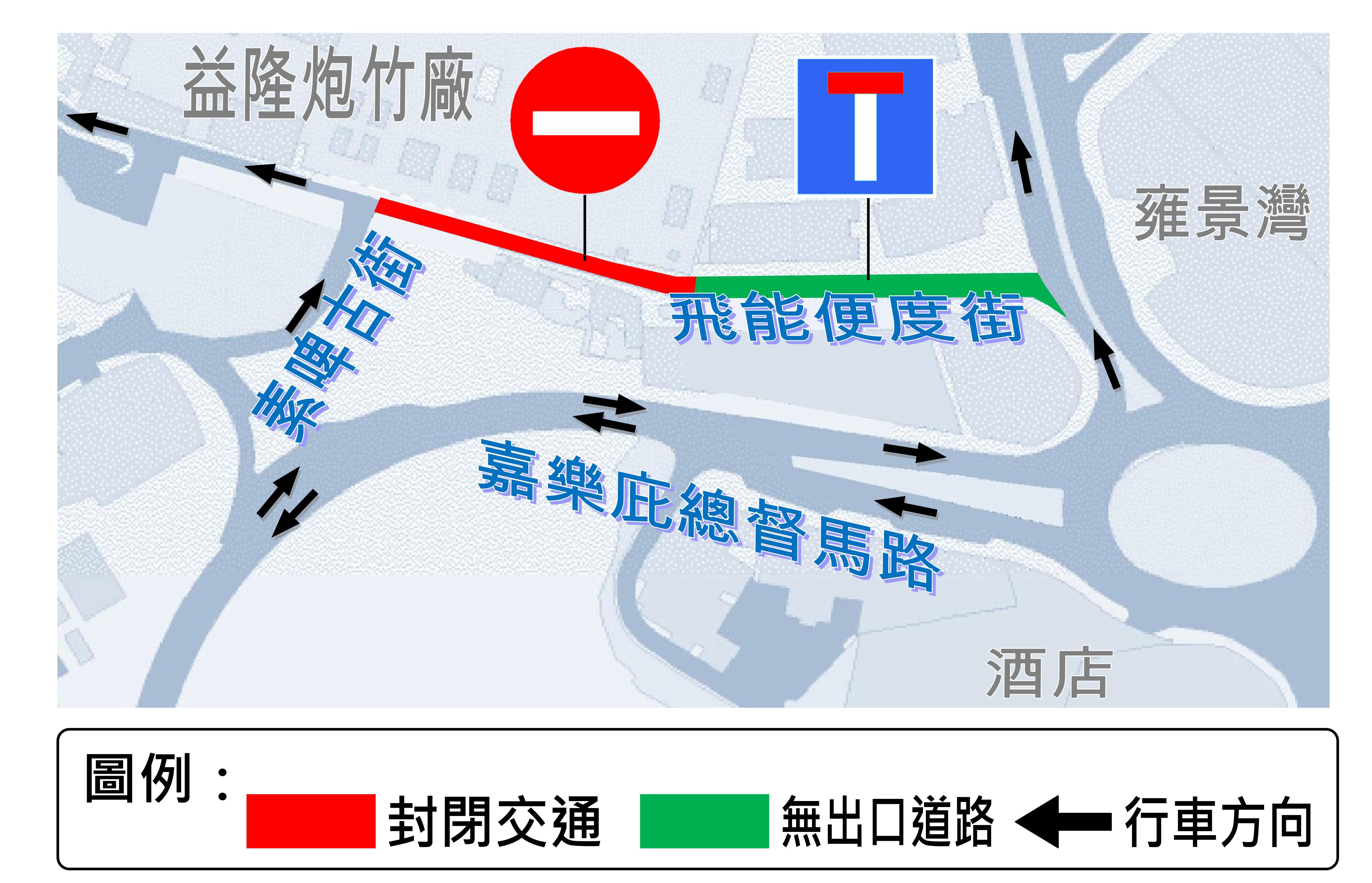 因應工程進行,介乎信虹花園與素啤古街之間的一段飛能便度街,本月11月(周一)早上10時至本月21日臨時封閉交通,同時介乎奧林匹克大馬路與信虹花園之間的一段飛能便度街亦會改為無出口道路,並禁止車長超過5米之車輛駛入。