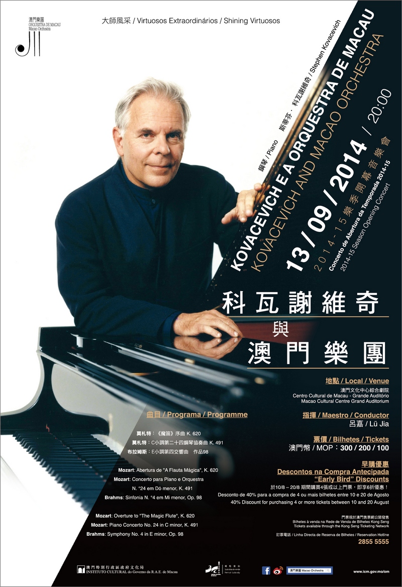 文化局澳門樂團二零一四至二零一五樂季開幕音樂會《科瓦謝維奇與澳門樂團》將於九月十三日晚上八時假文化中心綜合劇院舉行。開幕音樂會特別邀請到國際頂尖鋼琴家科瓦謝維奇(Stephen Kovacevich),與澳門樂團聯袂呈獻莫扎特鋼琴之夜,為樂季打響頭炮。