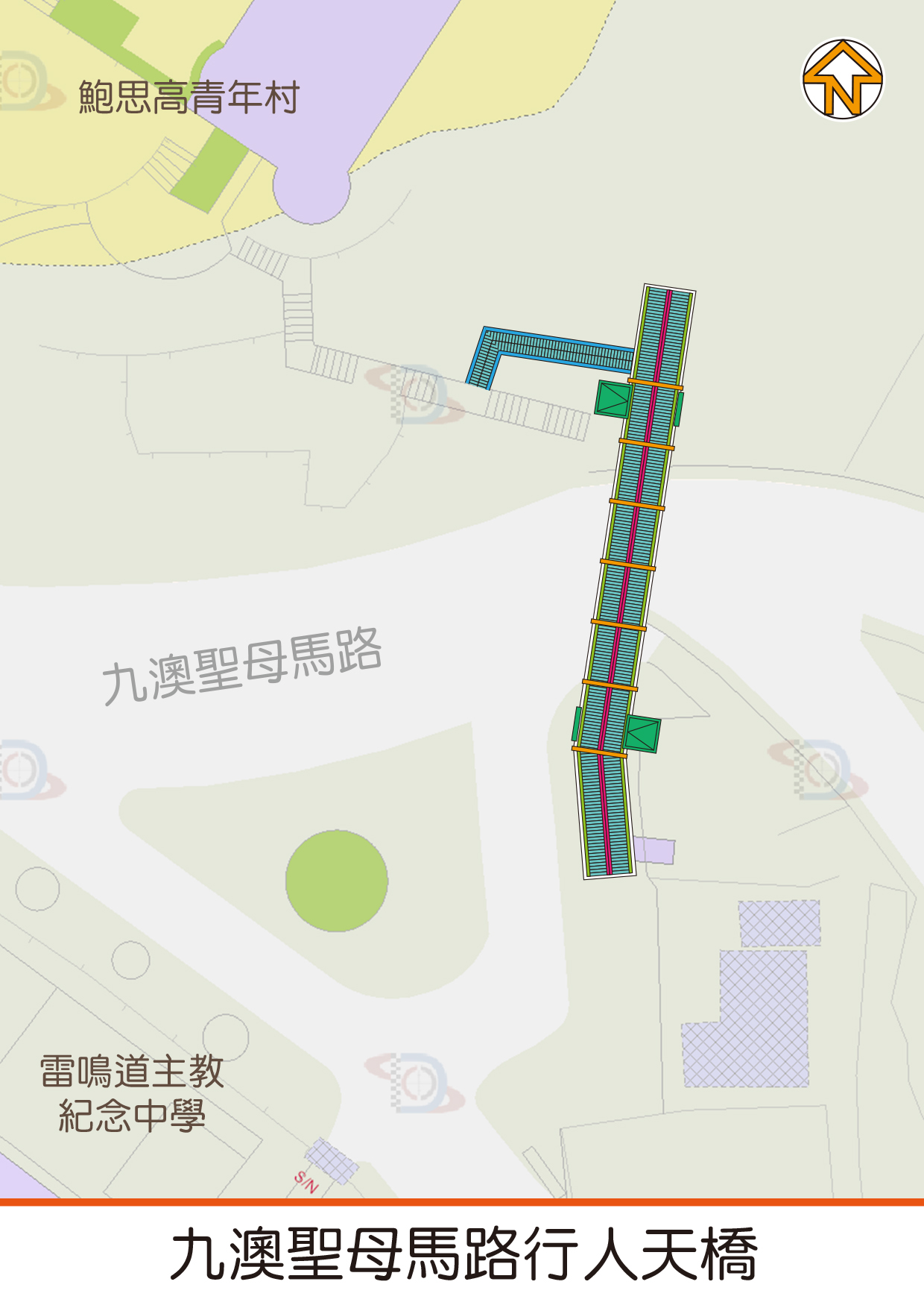 行人天橋將横跨九澳聖母馬路,以鋼結構建造為主,橋身主跨度約23米,兩個落腳點分別靠近雷鳴道主教紀念中學與鮑思高青年村後門,均設有升降機及樓梯。升降機設有凸字按鈕、低位操作面板及話音提示系統等無障礙設施,當遇上火警或停電,升降機具有自動返回地面層及開門功能,緊急停止運行時也會自動啟動撥號的急修通報裝置。天橋及升降機內將安裝錄像監察系統,出入口設有導盲磚及遮蔭擋雨設施。