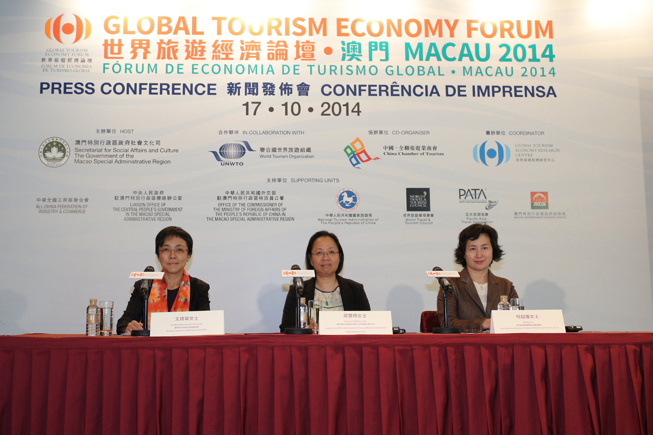 澳門特別行政區政府社會文化司司長辦公室代主任梁慧明及澳門特別行政區政府旅遊局局長文綺華在新聞發佈會上致辭,世界旅遊經濟論壇副主席兼秘書長何超瓊介紹論壇詳細議程及與會嘉賓。