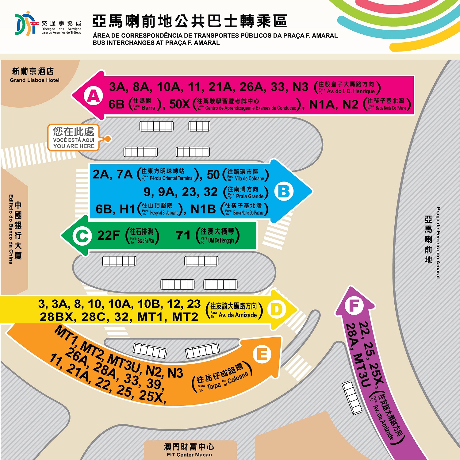 配合社會發展對巴士服務的需求,交通事務局近年致力開展各項巴士優化工作,除增加巴士數量、調整出車班次、巴士路線分流、分拆巴士路線,並透過逐步建立以快速、幹道、一般及接駁等不同形式構建公共交通網絡,以更好地發揮巴士服務效能外,亦透過調整巴士乘車空間,理順乘車秩序。其中,關注亞馬喇前地巴士轉乘站分別設有A、B、C、D、E及F車道,供41條巴士路線使用。隨著澳門交通環境變化,市民大眾不僅對巴士服務的需求持續上升,對各路線的需求也有所轉變。有見及此,交通事務局需要調整上述轉乘站內各巴士路線的停靠位置,調整後,原來停靠E車道的50路線改停靠B車道,而50X路線則改停靠A車道。