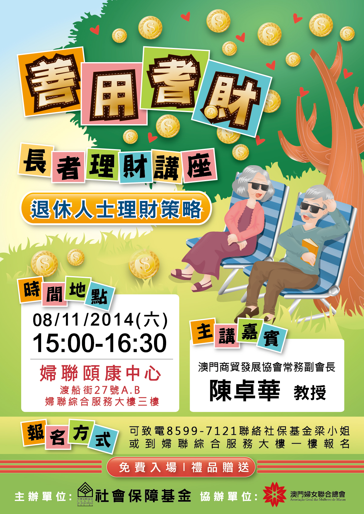 為向長者灌輸正確的理財知識,讓其學會如何善用財富安享晚年生活,社會保障基金舉辦“善用耆財”長者系列理財講座,11月8日(六)的場次主題為“退休人士理財策略”,活動詳情如下:
