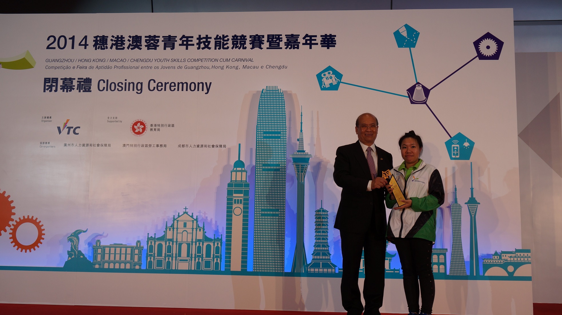 由香港職業訓練局主辦、廣州市人力資源和社會保障局、澳門勞工事務局和成都市人力資源和社會保障局聯合舉辦的「2014穗港澳蓉青年技能競賽暨嘉年華」於10月31日至11月1日在香港啟德郵輪碼頭順利舉行。澳門代表選手陳志麟,羅偉豪及張焯能於隊制賽的「智能家居電器安裝」項目發揮團隊合作精神,沉著應戰,獲得銀獎;個人賽方面,倫潁如在「時裝設計與技術」項目及甘梓茵在「美容護理」項目,憑著頑強鬥志,經過一番苦鬥,雙雙獲得銅奬。而陳志麟、羅偉豪、張焯能、倫潁如及甘梓茵亦同時獲得本澳成績最優奬,為澳爭光。勞工事務局感謝各項目代表單位、專家及導師等,在賽前為各選手提供全面而深入的強化培訓。