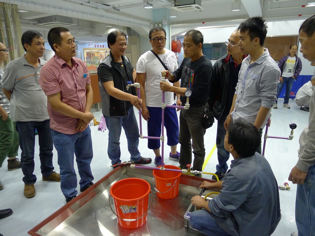 學員在工作坊上就再生水水管的接駁和安裝方面進行了實務操作。在導師的專業指導下,學員應用剪切及熱熔工具,接駁再生水水管所採用的PPR管材,切身了解PPR管材的特點、配件的用途和接駁技術,包括管材接駁的前期準備工作、熱熔機器的運用、溫度及時間的掌握等要點。學員亦被安排以分組形式進行練習,在完成管道接駁後,須對管道進行壓力測試來試驗其接駁效果。完成培訓工作坊的學員將會獲證書。