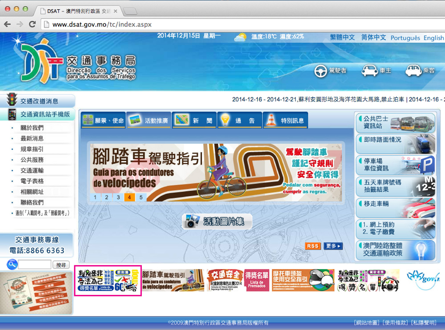 「判別是非,守法為己」交通安全有獎遊戲舉辦以來,參加者反應踴躍。其中,罰則篇交通安全有獎遊戲已於11月14日截止,交通事務局共收到4,612份參加表格,扣除答錯及重覆參加的1,372份,符合抽獎資格共有3,240份,經電腦隨機抽出50名得獎者,每人均可獲內附一百元的特別版電子貨幣儲值咭一張。正確答案及得獎名單已上載於交通事務局網頁www.dsat.gov.mo,歡迎瀏覽。如有疑問,可致電交通事務局專線88666363查詢。