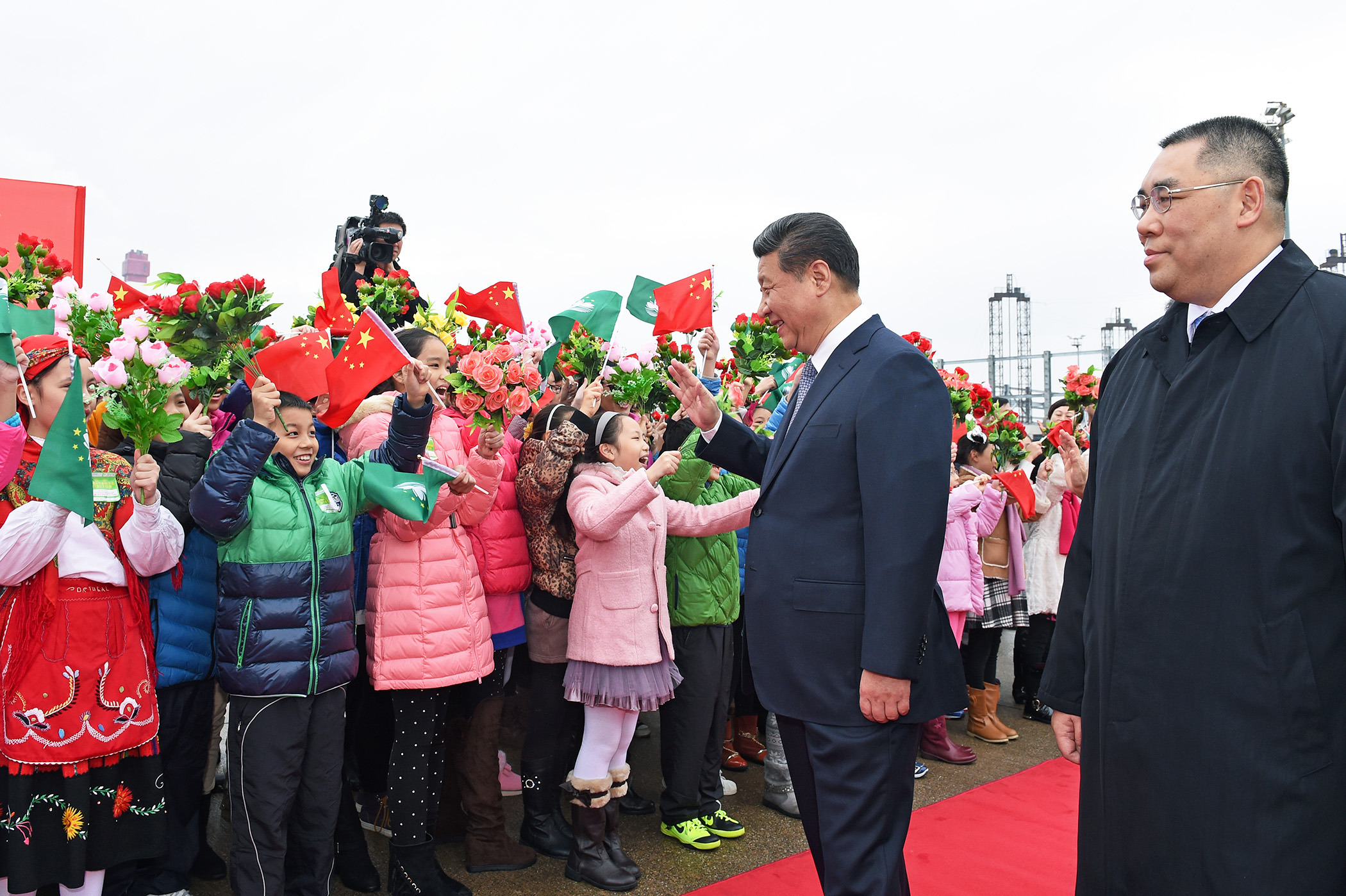習近平主席一行乘坐的專機中午約12時抵達澳門國際機場,航機停在停機坪後,行政長官伉儷登上機艙迎請。習近平伉儷下機後,接受濠江學校一雙男女小學生獻上的花束,並沿紅地氈與在場迎接的各主要官員握手,且受到300名手持國旗、區旗和絹花、來自濠江、勞校及鏡平學校的小學生熱烈歡迎,習近平伉儷頻向迎迓群眾揮手致意。