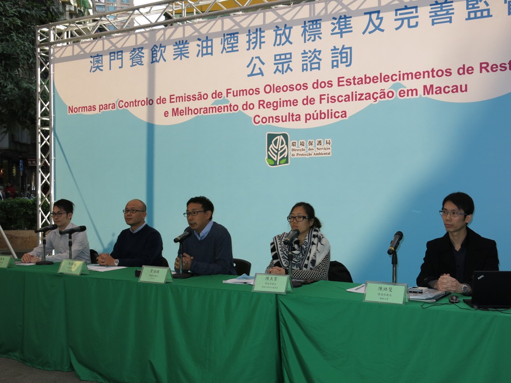 環境保護局現正進行《澳門餐飲業油煙排放標準及完善監管制度》的諮詢工作,並於今日(2015年1月17日)在三盞燈休憩區舉辦公眾諮詢會,藉此介紹諮詢文本的內容,進一步收集社會的意見和建議。