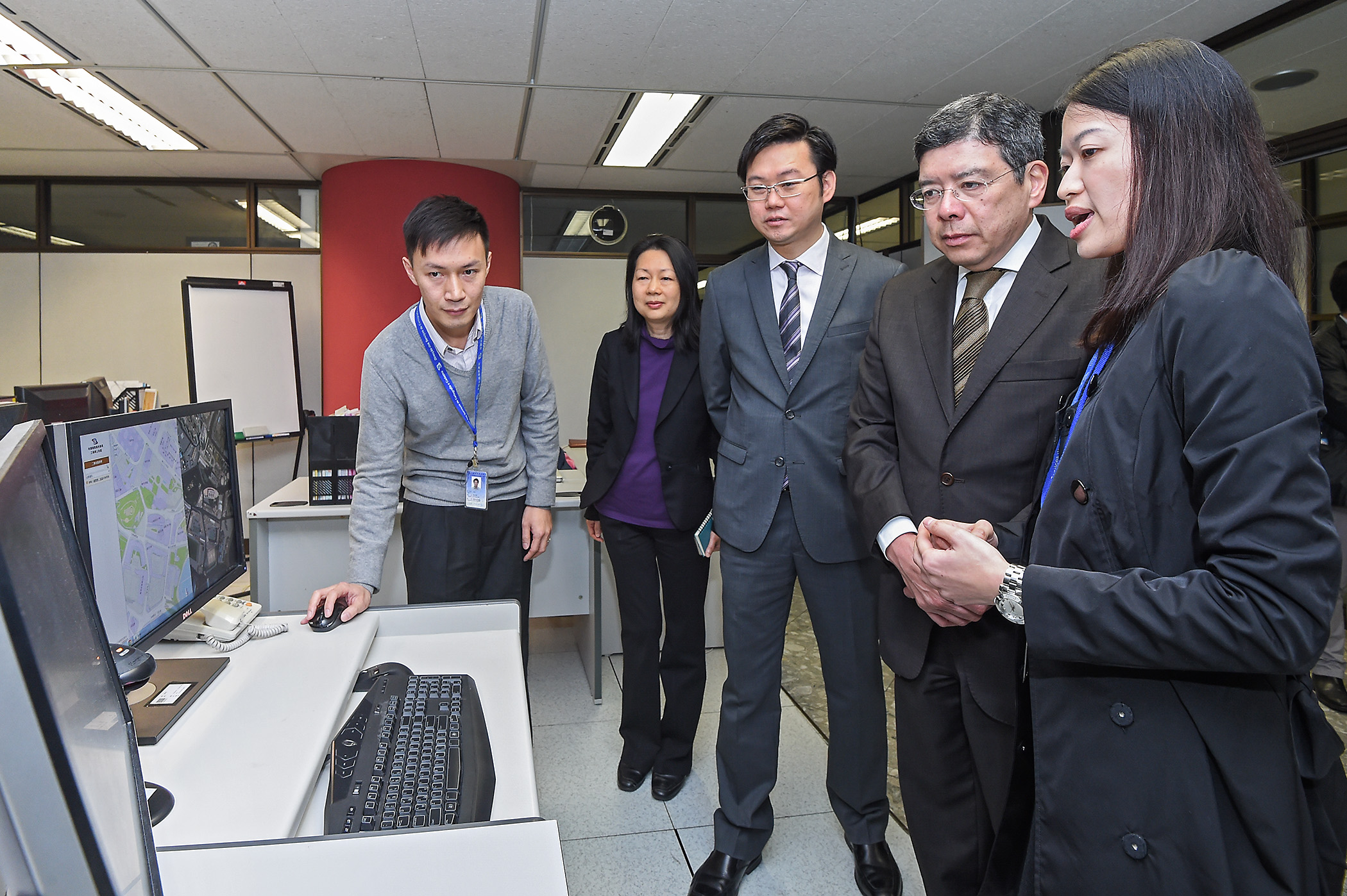 最後,羅立文司長前往地圖繪製暨地籍局,在局長張紹基陪同下逐一了解各個部門的運作,並聽取主管人員講解近年地籍資料收集和地圖繪製技術的最新情況。他鼓勵部門人員努力緊守崗位,並透過適時優化硬件設施,進一步提升工作效率,更好地回應社會發展需要。