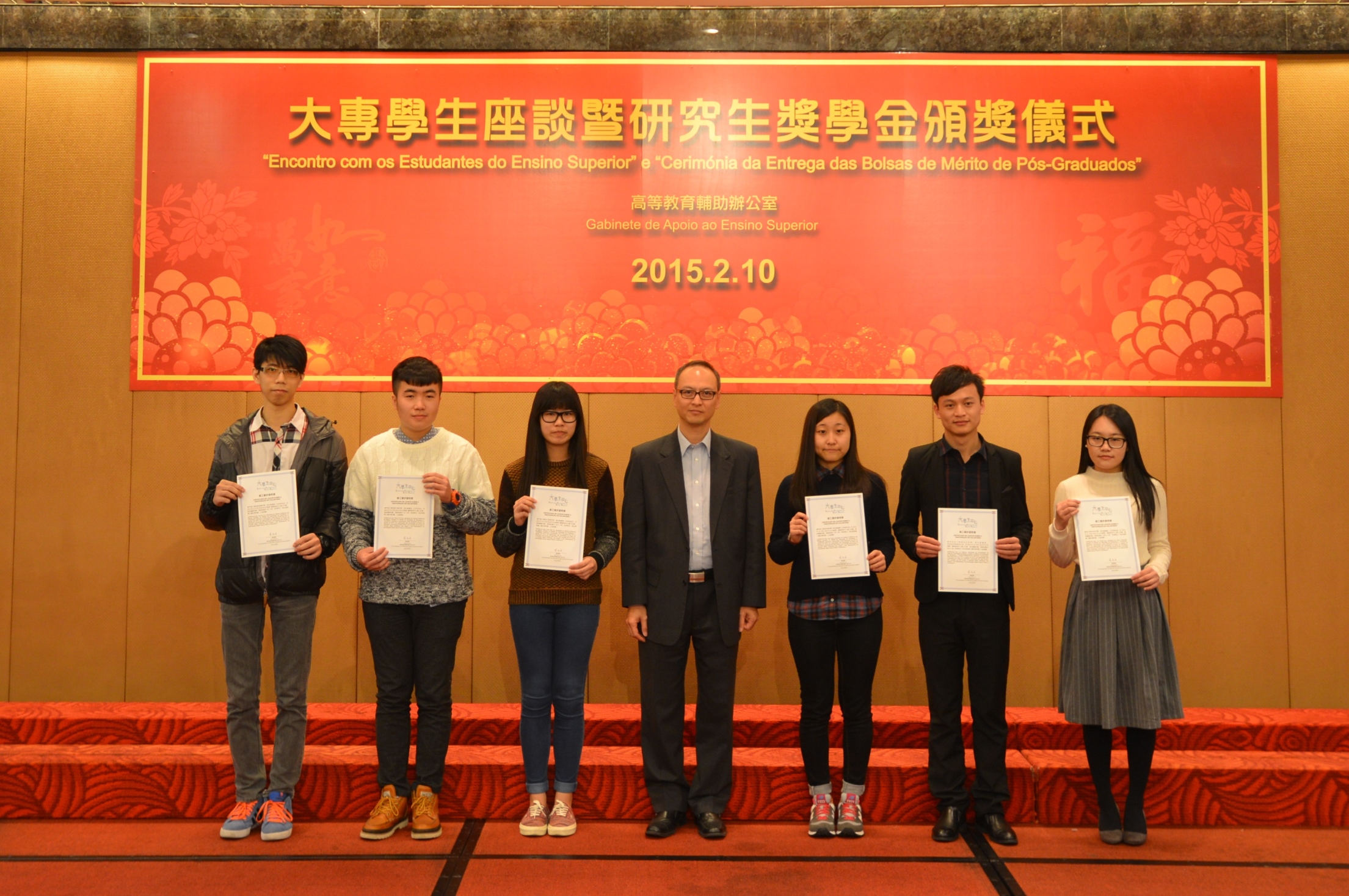 此外,研究生資助發放技術委員會舉行2014/2015學年研究生獎學金頒獎儀式,高教辦主任、研究生資助發放技術委員會主席蘇朝暉,何麗鑽委員、何桂鈴委員以及高教辦副主任、研究生資助發放技術委員會何絲雅委員向碩士獎學金、碩博連讀的博士獎學金、博士獎學金的獲獎學生頒發證書,並勉勵學生繼續努力。