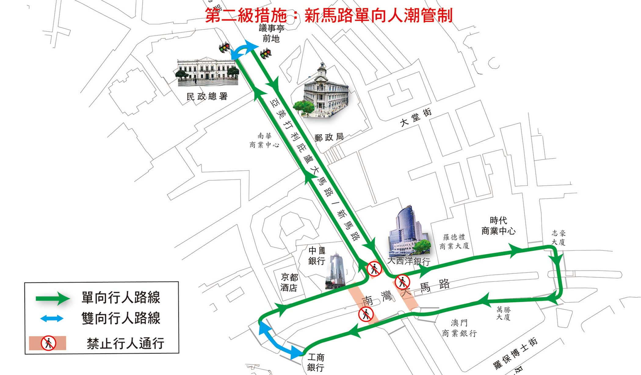 當第一級措施未能解決人群持續擠擁問題時,在第一級的基礎上,新馬路將實施單向人潮管制。行人需遵照附圖所示‘倒T’字型單向行進路線前往議事亭前地、大西洋銀行、滙豐銀行、商業銀行、工商銀行、中國銀行及民政總署等地點。
