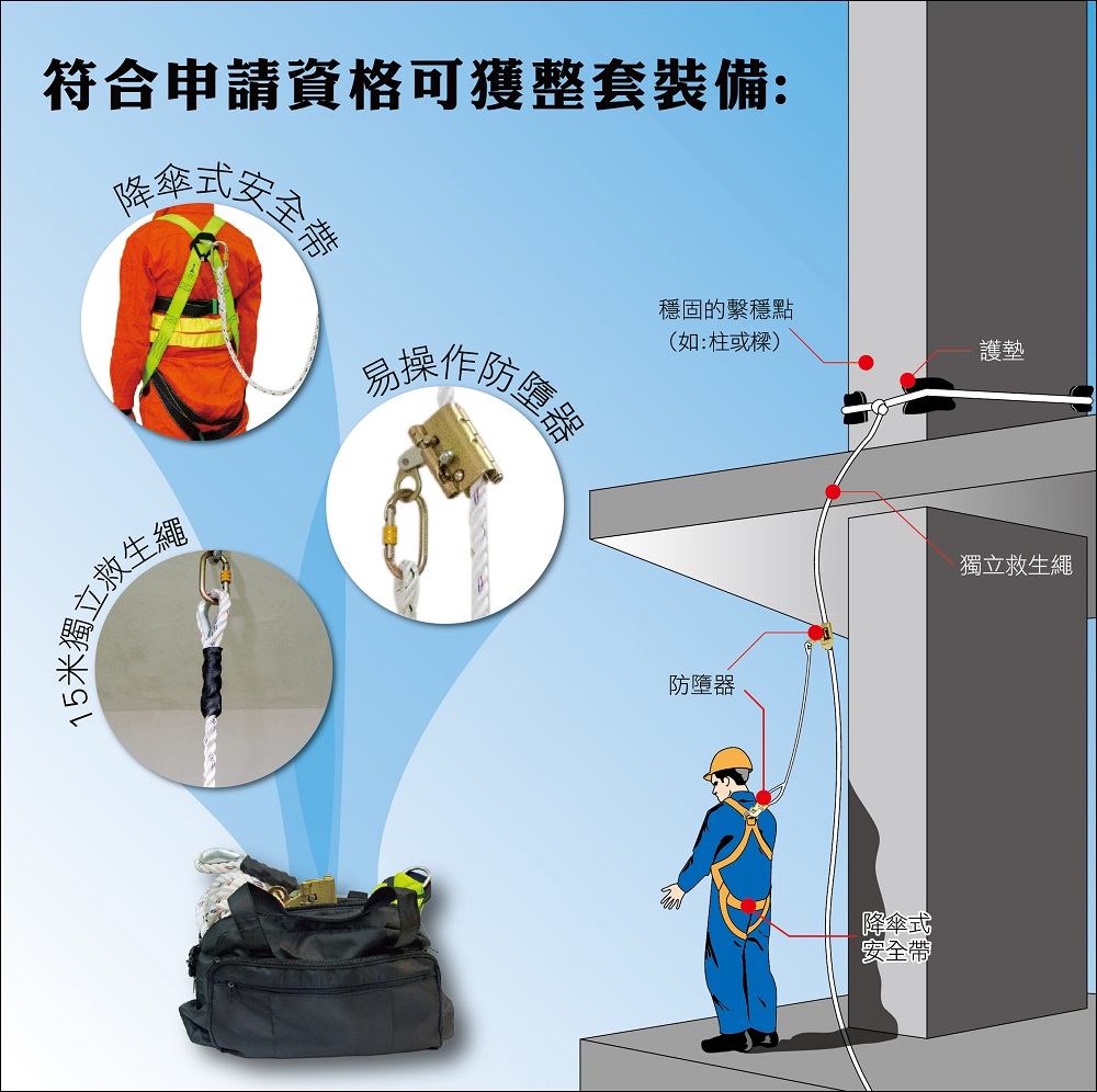 - 申請企業須最少安排2名持有有效建築業職安卡的人員,參加勞工事務局所提供的3小時“高空工作安全訓練”免費課程,學員經考核合格後可獲發證書,該中小企將可免費取得“安全帶、防墮器及獨立救生繩套裝”設備,上限為5套。