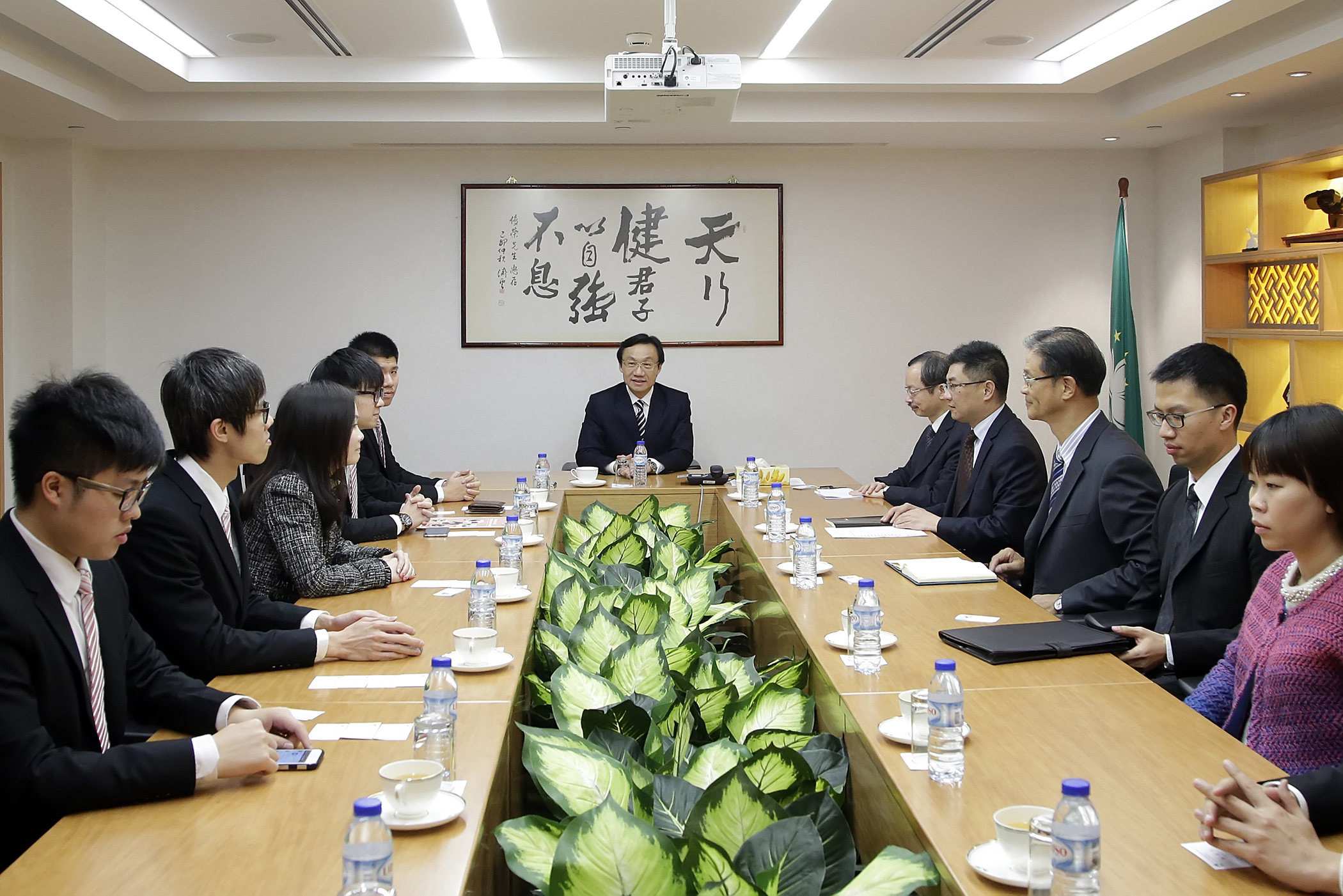 譚俊榮歡迎澳門學聯主席劉嘉翀、副主席黃俊傑、理事長梁子豪、秘書長吳碧珊等一行十三人到訪,表示特區政府非常重視教育和青年事務,他樂於多與青少年朋友交流,聼取意見和採納建議,努力培養青少年成爲日後建設澳門的棟樑。