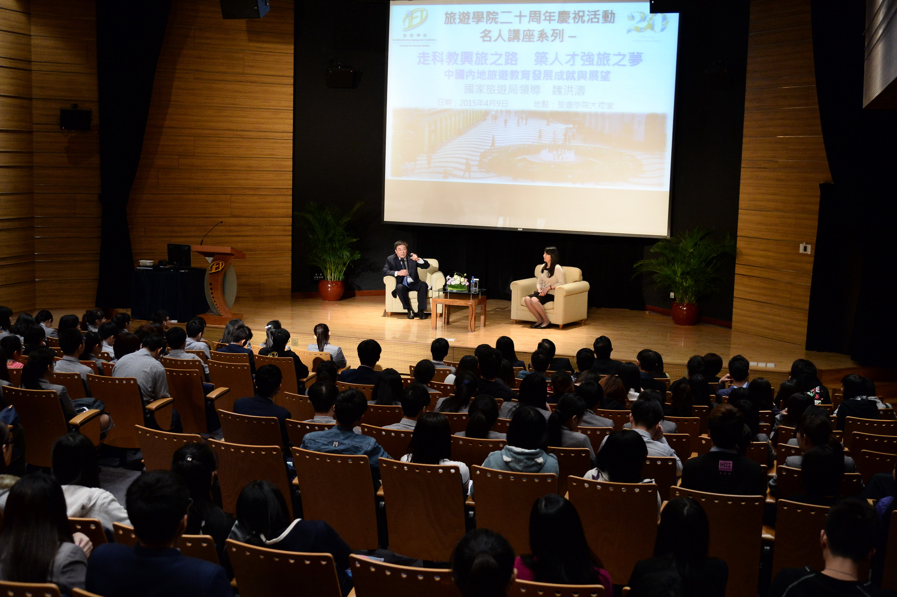 為慶祝澳門旅遊學院成立20周年,學院邀請國家旅遊局黨組成員、人事司司長魏洪濤先生於4月9日蒞臨學院開講及考察。國家旅遊局其他領導包括港澳台旅遊事務司司長劉克智、亞洲旅遊交流中心主任劉志江、亞洲旅遊交流中心助理主任耿東明等同行。出席講座的學生及教職員超過150人。魏洪濤司長以 “走科教興旅之路 築人才強旅之夢 – 中國內地旅遊教育發展成就與展望” 為題與旅遊學院師生展開熱烈的交流及討論。旅遊學院黃竹君院長、甄美娟副院長、澳門旅遊局謝慶茜副局長等出席講座。