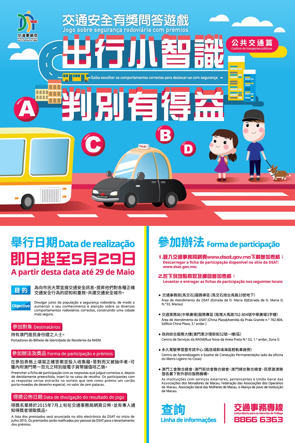 交通事務局推出「出行小智識 判別有得益」交通安全有獎問答遊戲,由即日起至5月29日,市民可前往交通事務局服務專區等多個指定地點索取參加表格,或是登入交通事務局網頁www.dsat.gov.mo下載,答對又被袖中的參加者,可獲特別版電子貨幣儲值咭一張,名額50名。