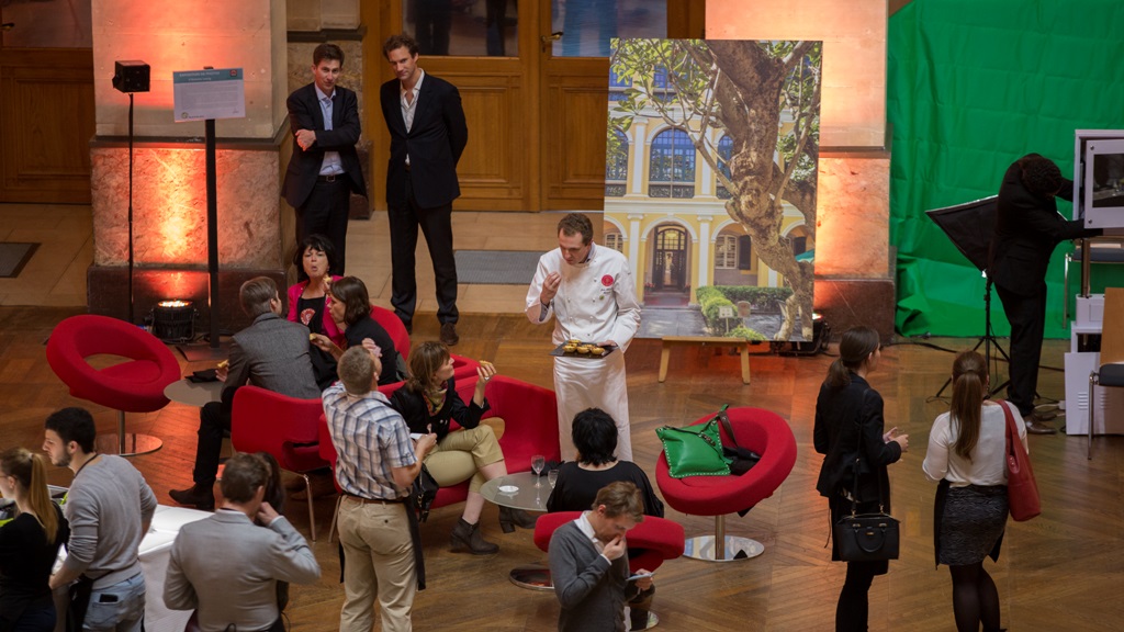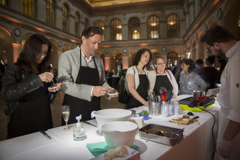 “Macau à table!” 開幕式於巴黎市中心的著名歷史建築,布隆尼亞爾宮(Palais Brongniart)盛大舉行,當晚的焦點集中在精心設計的菜式上。來自澳門廚藝協會的Mário Fernandes Gil及范健華與法國巴黎烹飪學院L’Atelier des Chefs的Jean-Sébastien Bompoil,三位廚師以土生菜作為設計靈感,為開幕式酒會創作一系列的佳餚。各款菜式及甜品在特設的展台上為嘉賓帶來揉合中西方食材和香料而烹煮成的土生菜。