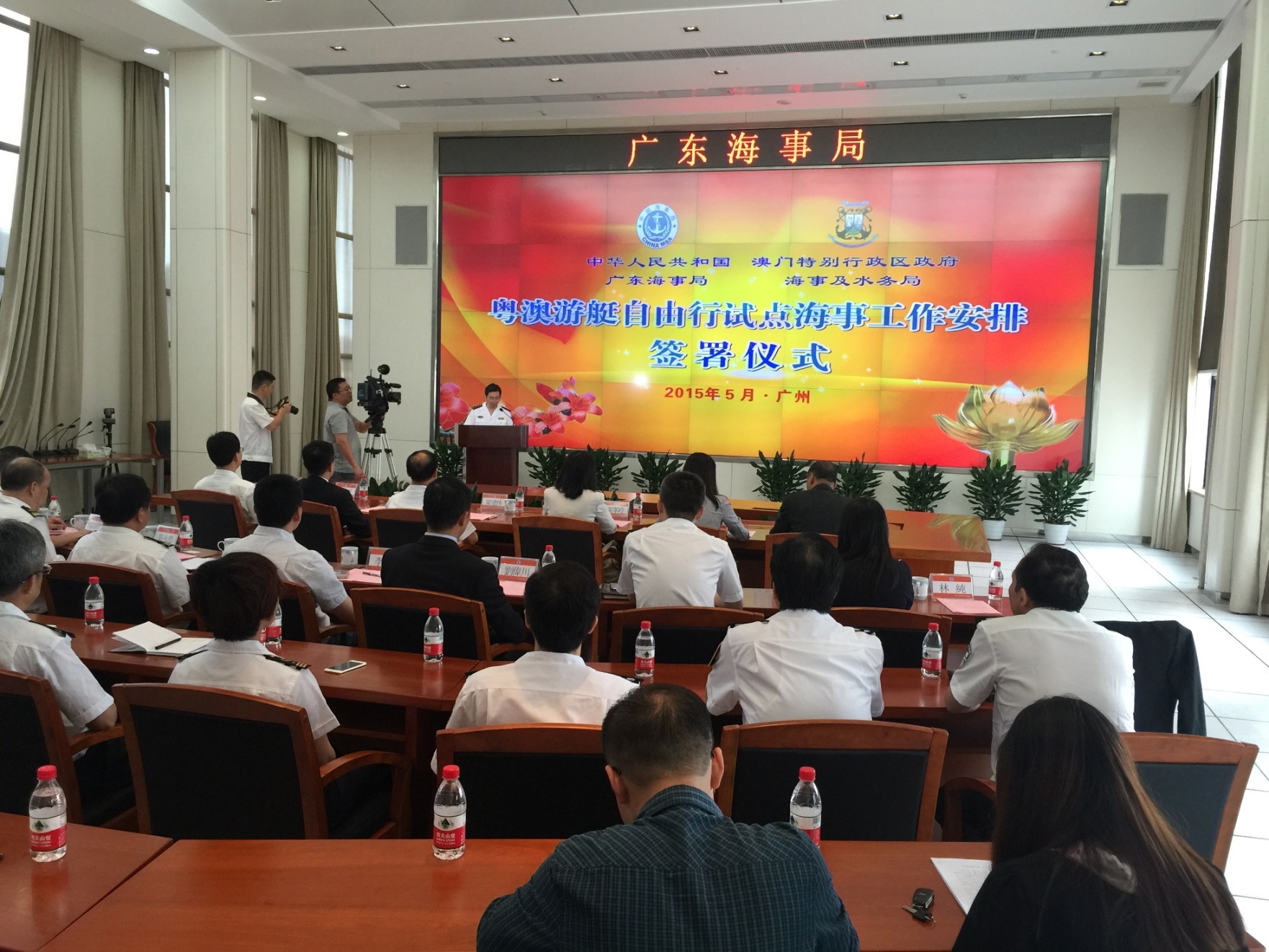 澳門特區政府代表團一行得到廣東省人民政府的盛情接待。廣東海事局副局長楊文和澳門海事及水務局船舶及船員廳廳長李榮勝分別介紹了兩地推進粵澳遊艇自由行的情況,其後雙方於廣東海事局舉行《工作安排》簽署儀式,在黨組書記兼廣東省港澳事務辦公室主任廖京山、中山市政府副市長楊文龍、澳門運輸工務司司長辦公室主任張翠玲等的見證下,廣東海事局局長梁建偉和澳門海事及水務局局長黃穗文代表粵澳雙方簽署了《工作安排》。