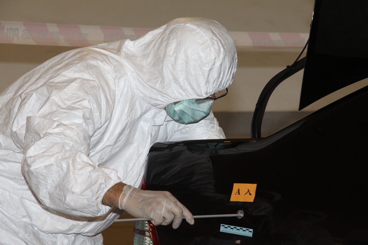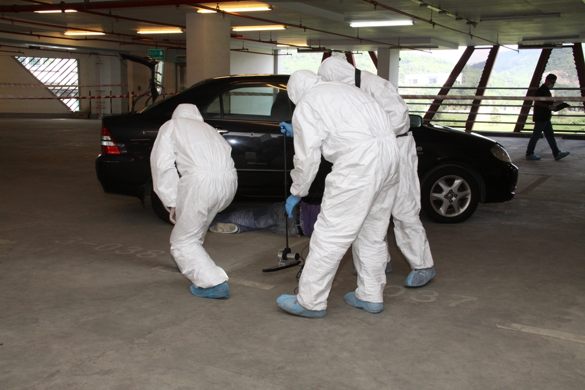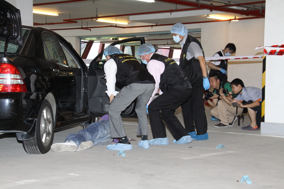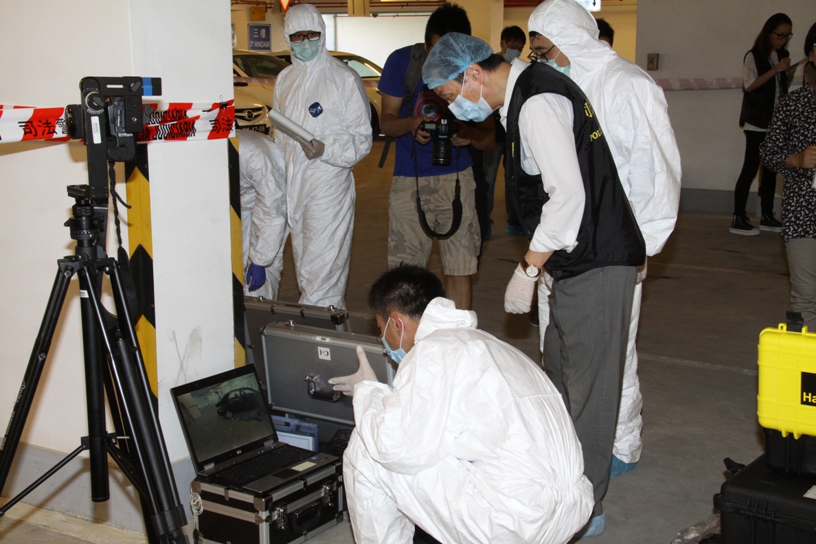 為加強處理嚴重罪案的協調能力,司法警察局進行犯罪現場勘查演習,模擬一名男子在毒品交易過程中被槍殺,伏屍停車場,交易的毒品被搶去,司警局接報後迅速趕赴現場進行調查及搜證,並啟動犯罪現場勘查程序。是次模擬演習達到預期效果。