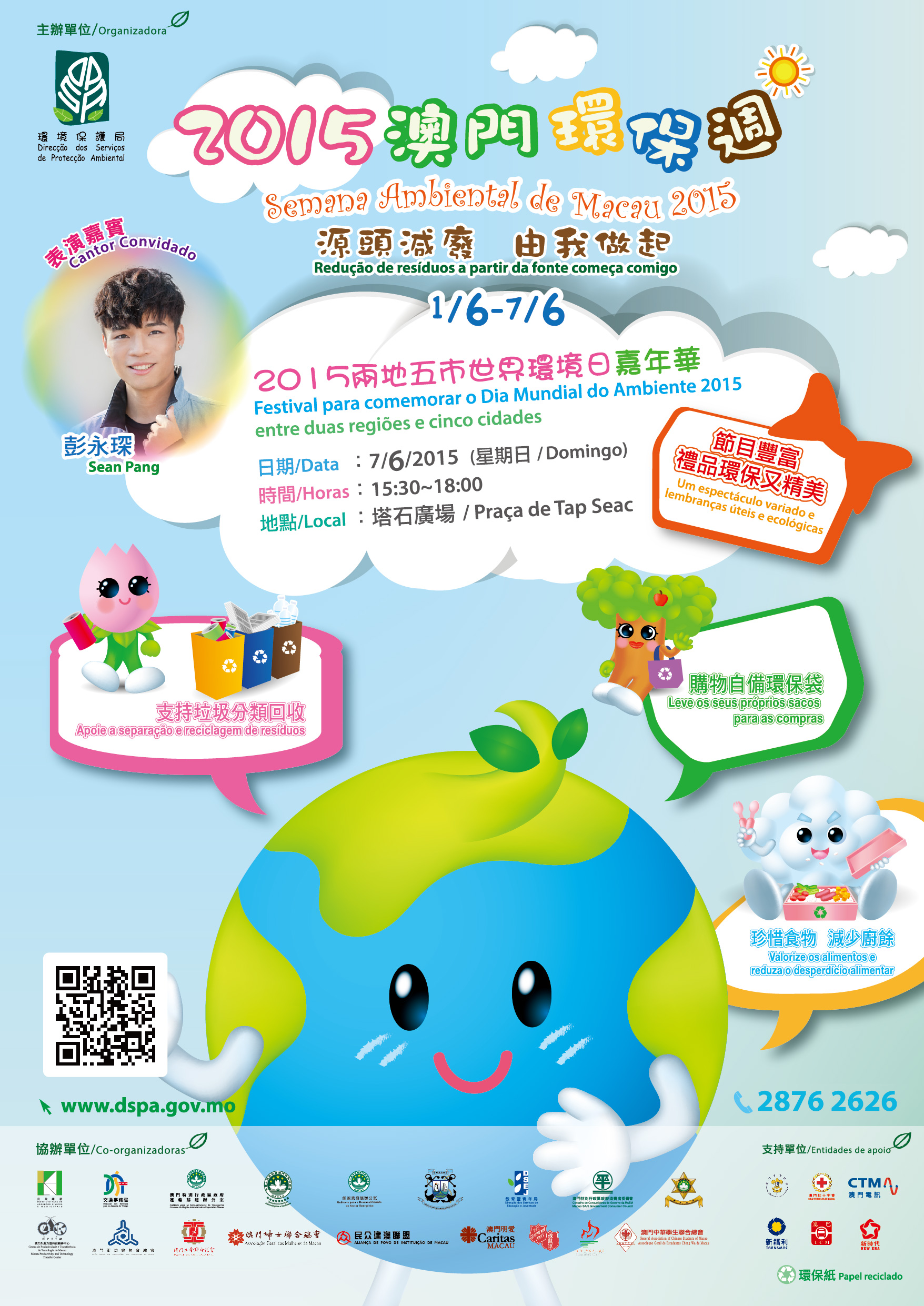 環境保護局誠邀全澳市民前來參與於6月7日(星期日)下午3時半假塔石廣場舉行的“2015兩地五市世界環境日嘉年華”,共渡一個極富意義的週日下午。詳情,歡迎瀏覽環境保護局網站www.dspa.gov.mo或致電“環保熱線"2876 2626查詢。