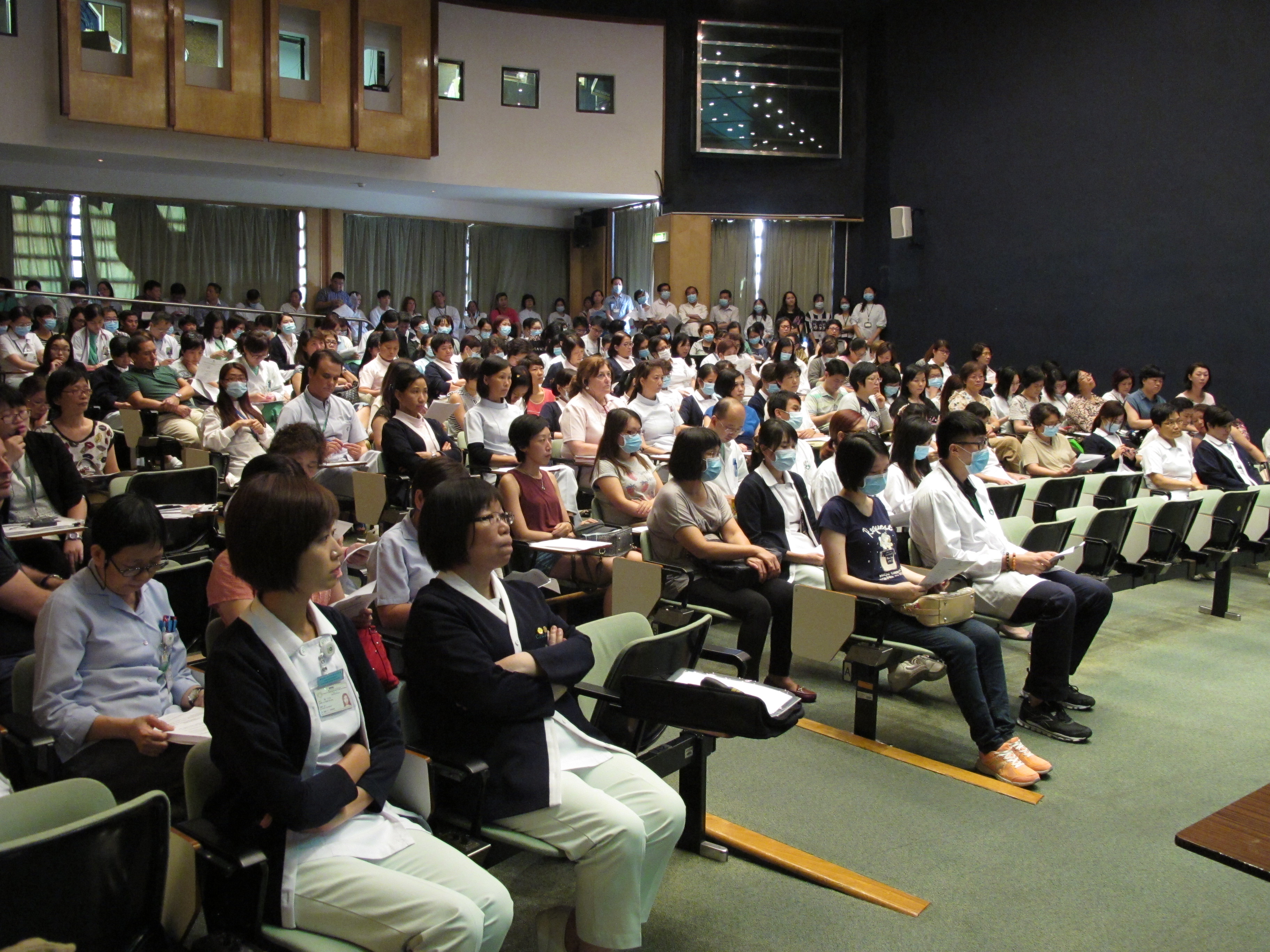 衛生局李展潤局長、疾病預防控制中心主任林松醫生、疾病預防控制中心傳染病防制暨疾病監測部協調員梁亦好醫生,向與會者講解目前中東呼吸道綜合徵的流行情況、通報、送檢流程、感染控制及防控措施。兩場講解會合共有約有350名醫護人員出席。