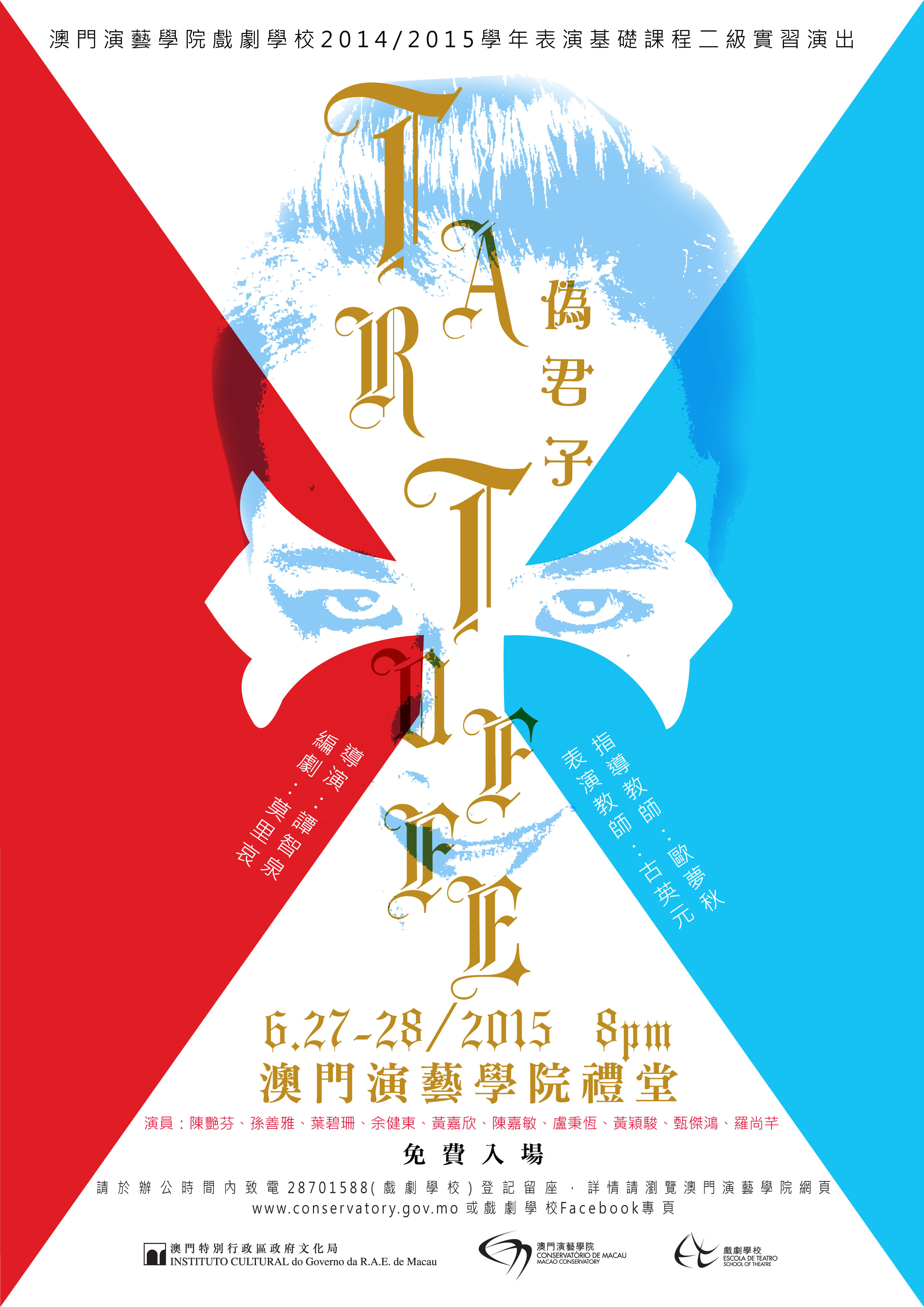 《偽君子》描寫偽裝聖潔的教會騙子達爾杜夫混進商人奧爾恭家,圖謀勾引其妻子並奪取其家財,最後真相敗露,鋃鏜入獄。該劇深刻揭露了當時社會的虛偽和醜惡,達爾杜夫(Tartuffe)一詞日後更成爲了“偽君子”的代名詞。是次演出為戲校表演基礎課程二級的期末實習演出,特邀本澳專業導演譚智泉執導。譚智泉畢業於上海戲劇學院導演系,曾任澳門演藝學院戲劇學校表演課程兼職教師,二零一四年赴德國柏林進修表演藝術,擔任慕尼黑瑪塔劇院(Meta-Theater)實習導演及工作坊導師,其作品多次獲邀參加國際性地區藝術節,足跡遍及港澳、內地、台灣、韓國、波蘭、德國、英國等地。演員陣容包括:陳艷芬、孫善雅、葉碧珊、余健東、黃嘉欣、陳嘉敏、盧秉恆、黃穎駿、甄傑鴻及羅尚芊。