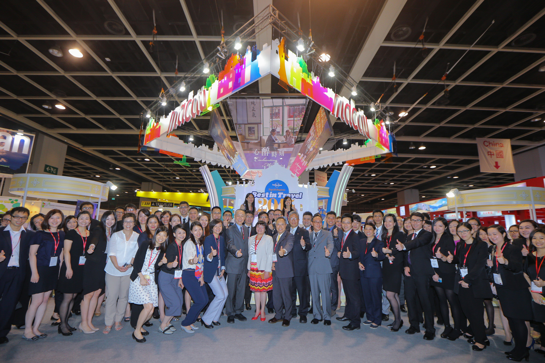 今年展位的主題繼續為「感受澳門 動容時刻」,以不同形式的燈光效果與澳門建築物剪影為設計元素,配上如蓮花綻放般的五片「動容時刻」宣傳廣告。位於接待處後的「光影‧大三巴」背景加上彩虹燈帶滲光效果,帶出澳門的亮麗及精彩。