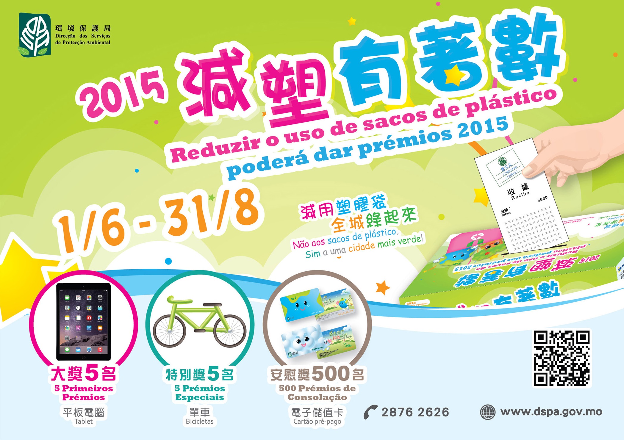 為鼓勵和推動公眾愛惜資源、實踐「減塑」,環境保護局今年繼續舉辦「減塑有著數」活動。凡澳門居民於2015年6月1日至8月31日期間到超過130間指定商號分店消費時不索取塑膠購物袋,或自備購物袋而不另索取塑膠購物袋,則可於收據上加蓋指定印章和填妥個人資料,投於活動的專屬收件箱內即可參加大抽獎。豐富獎品包括:大獎5名(平板電腦)、特別獎5名(單車)及安慰獎500名(內含100澳門元的電子儲值卡),期望得到全民的支持。