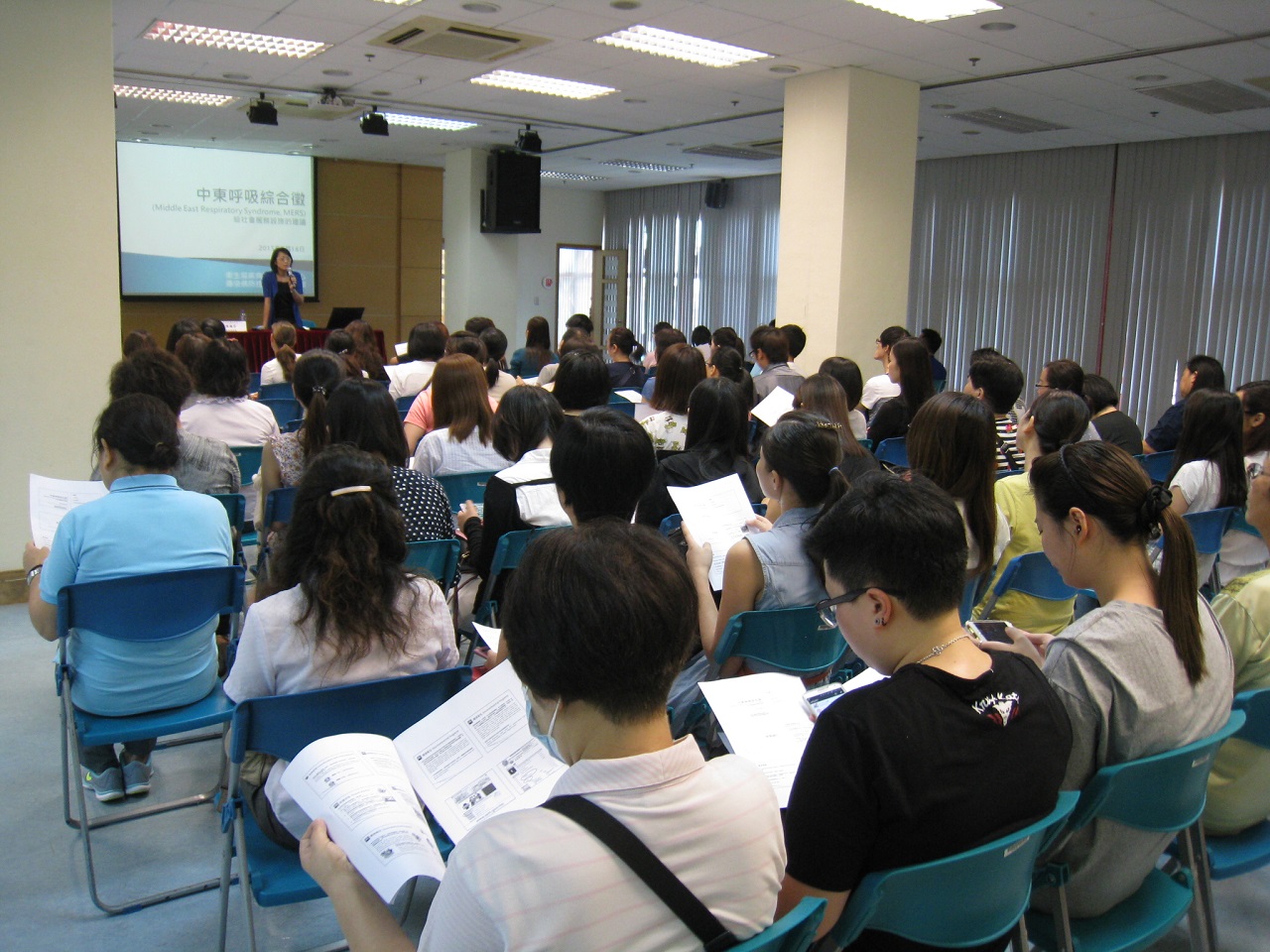 為預防中東呼吸綜合徵,社會工作局本月18日為社會服務設施人員舉行兩場「預防中東呼吸綜合徵」講座,約有一百四十五間設施、一百四十八人參與。