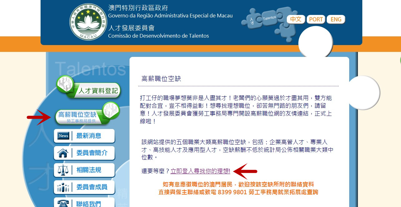 居民只需登入人才發展委員會網站主頁https://www.scdt.gov.mo,點擊“高薪職位空缺”,透過“立即登入尋找你的理想”按鍵,即可進入勞工局提供的高薪職位友情連結,開始搜尋理想職位。