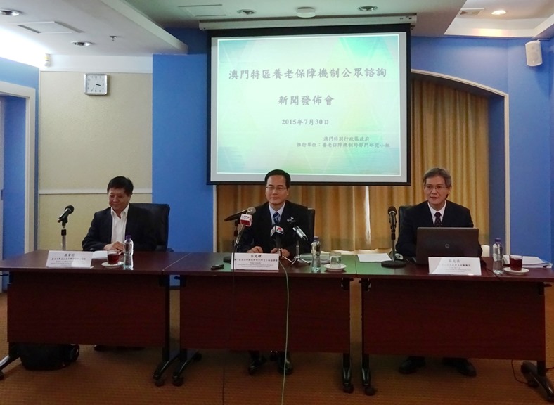 澳門養老保障機制跨部門研究小組就“澳門特區養老保障機制公眾諮詢”舉行新聞發佈會,由小組協調員、社會工作局容光耀局長,社會互助廳蔡兆源廳長,以及香港嶺南大學亞太老年學研究中心陳章明總監介紹“澳門特區養老保障機制”的內容及公眾諮詢的具體安排,多個政府部門代表均有出席。