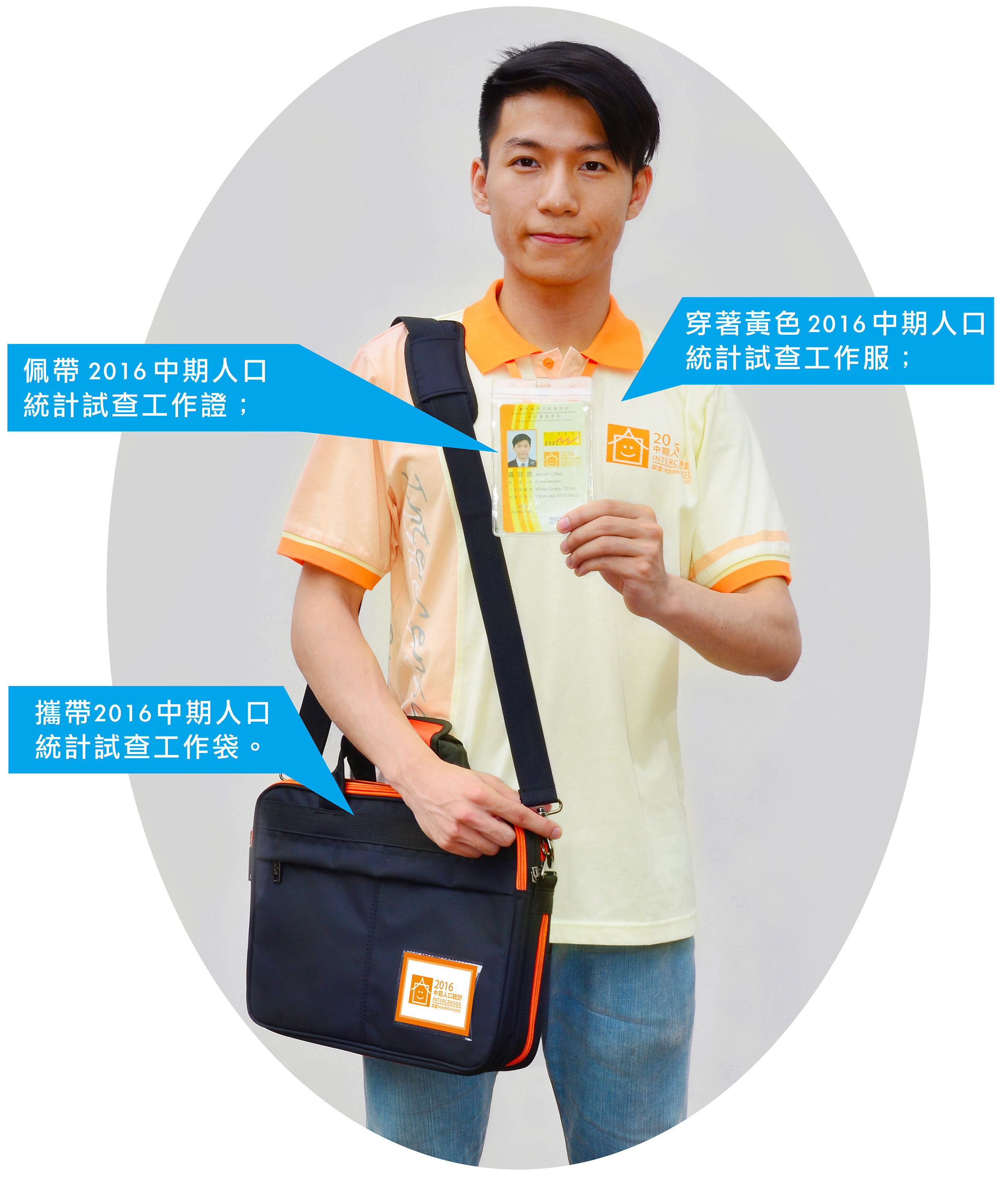 所有調查員均穿著黃色試查工作服、佩戴有效工作證及攜帶試查工作袋,於試查期間到訪被抽中的住宅單位,向住戶收集資料。住戶亦可選擇於8月11日至21日期間登入2016中期人口統計網頁(www.dsec.gov.mo/Intercensos2016)填報問卷。所有收集到的個人及個別住戶資料絕對保密,只作統計用途,請廣大市民放心提供準確資料。如欲查核調查員身份或預約訪問時間,請致電試查熱線8809 8809。