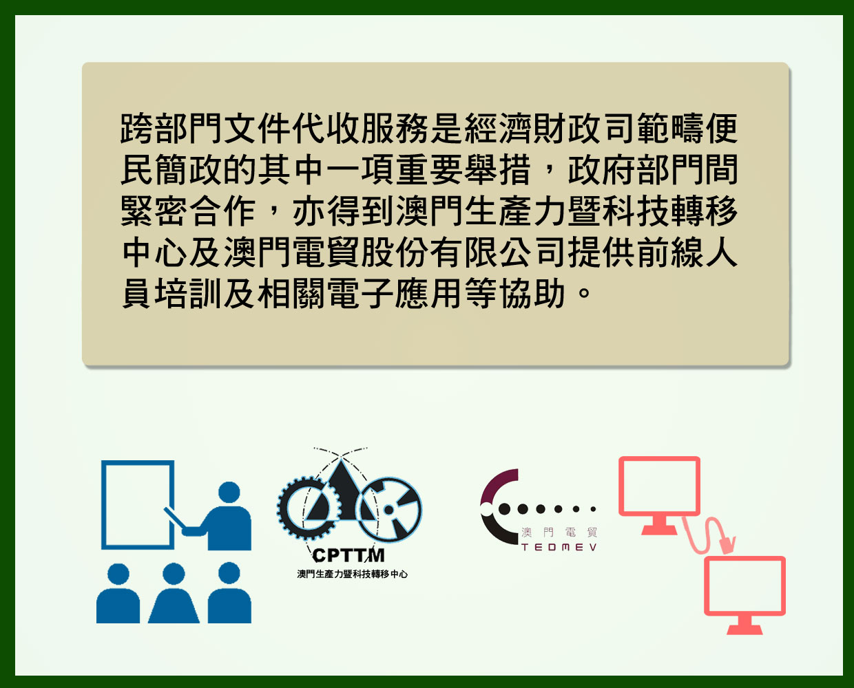 跨部門文件代收服務是經濟財政司範疇便民簡政的其中一項重要舉措,政府部門間緊密合作,亦得到澳門生產力暨科技轉移中心及澳門電貿股份有限公司提供前線人員培訓及相關電子應用等協助。