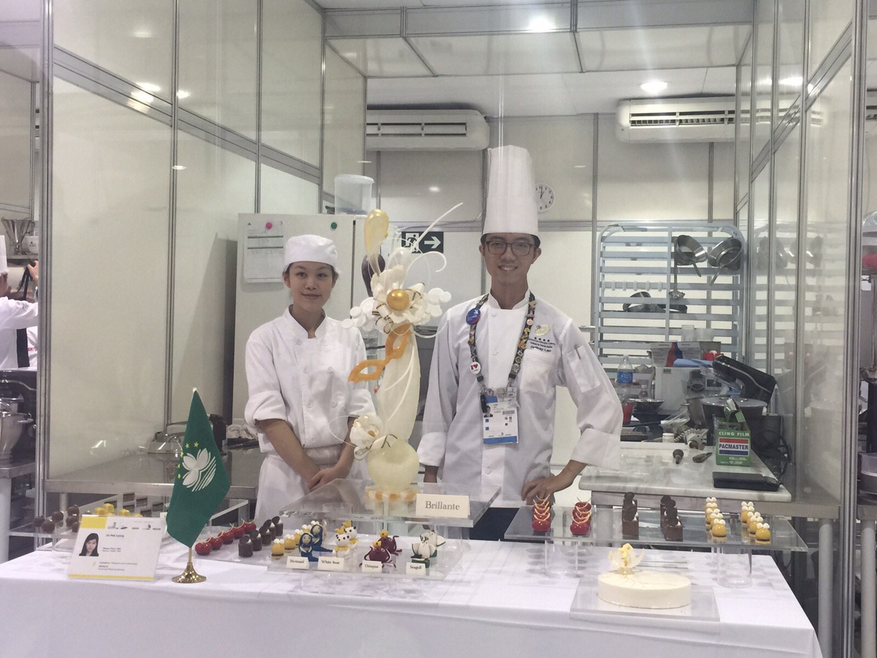 由學院兩位項目專家廚藝管理學士學位課程協調員馬克吉布森副教授及劉擇祥導師帶領下,兩位學生到巴西參賽,與頂尖高手進行競賽及互相學習。梁婉璧在糖果/糕點製作比賽的決賽中,取得516分 (相等於86%),於21個參賽國家及地區中位列第8,獲頒優異獎;曹傑亦於西式烹調決賽取得497分 (相等於82.83%) 的佳績,曹傑雖因3分之差( 0.5%) 而無緣奪獎,但表現亦相當不俗。兩位學生代表澳門及旅遊學院參加此世界級大賽,對他們來說是十分寶貴的經驗。而且,參賽者及同行的專家都把握機會吸收先進技術,並把技術帶回澳門與同輩分享。