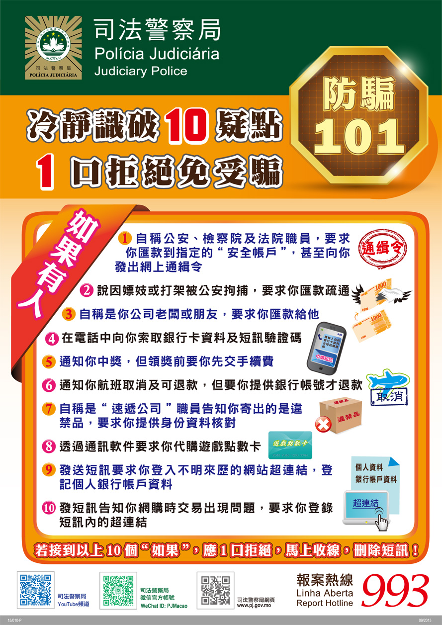 為了有效預防和打擊電話詐騙犯罪,司警局持續進行相關防罪宣傳工作,並與相關政府部門及機構,以及內地公安部門等合作,共商對策。因應電話騙案的作案手法多變,司警局特別綜合本澳曾出現的10種常見電話騙案作案手法及預防方法,印製主題為“防騙101”的新款預防電話騙案宣傳單張派發給市民,提醒他們如懷疑遇到單張內所列舉的電話詐騙手法,應一口拒絕騙徒的要求,以免上當受騙。