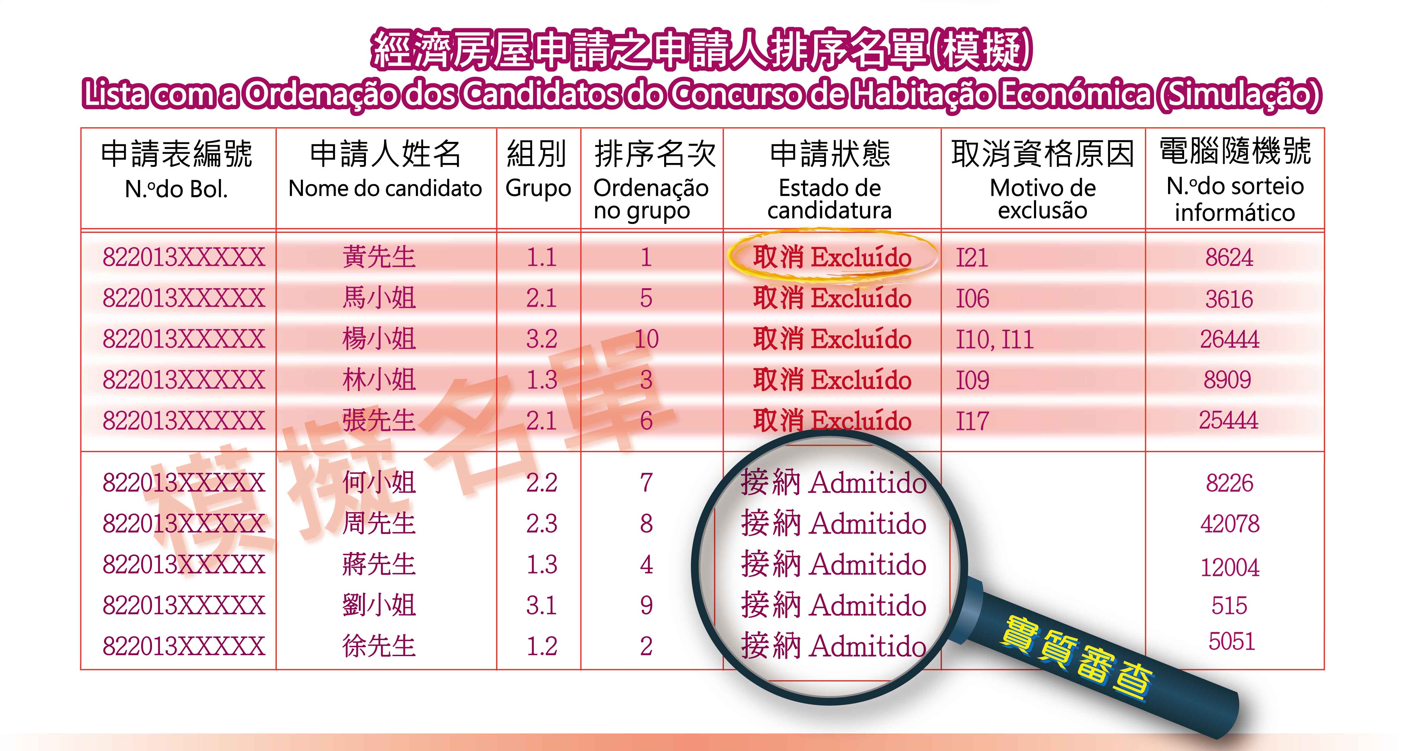房屋局將按照經第272/2015號行政長官批示修改的第347/2013號行政長官批示及經第11/2015號法律修改的第10/2011號法律《經濟房屋法》所指的電腦隨機抽號方式,邀請嘉賓以人手方式,即場抽出由8個數字組成的啓動碼,隨即輸入電腦啓動電腦隨機抽號,以制定一份包括獲接納的申請人及被取消資格的申請人的排序名單。