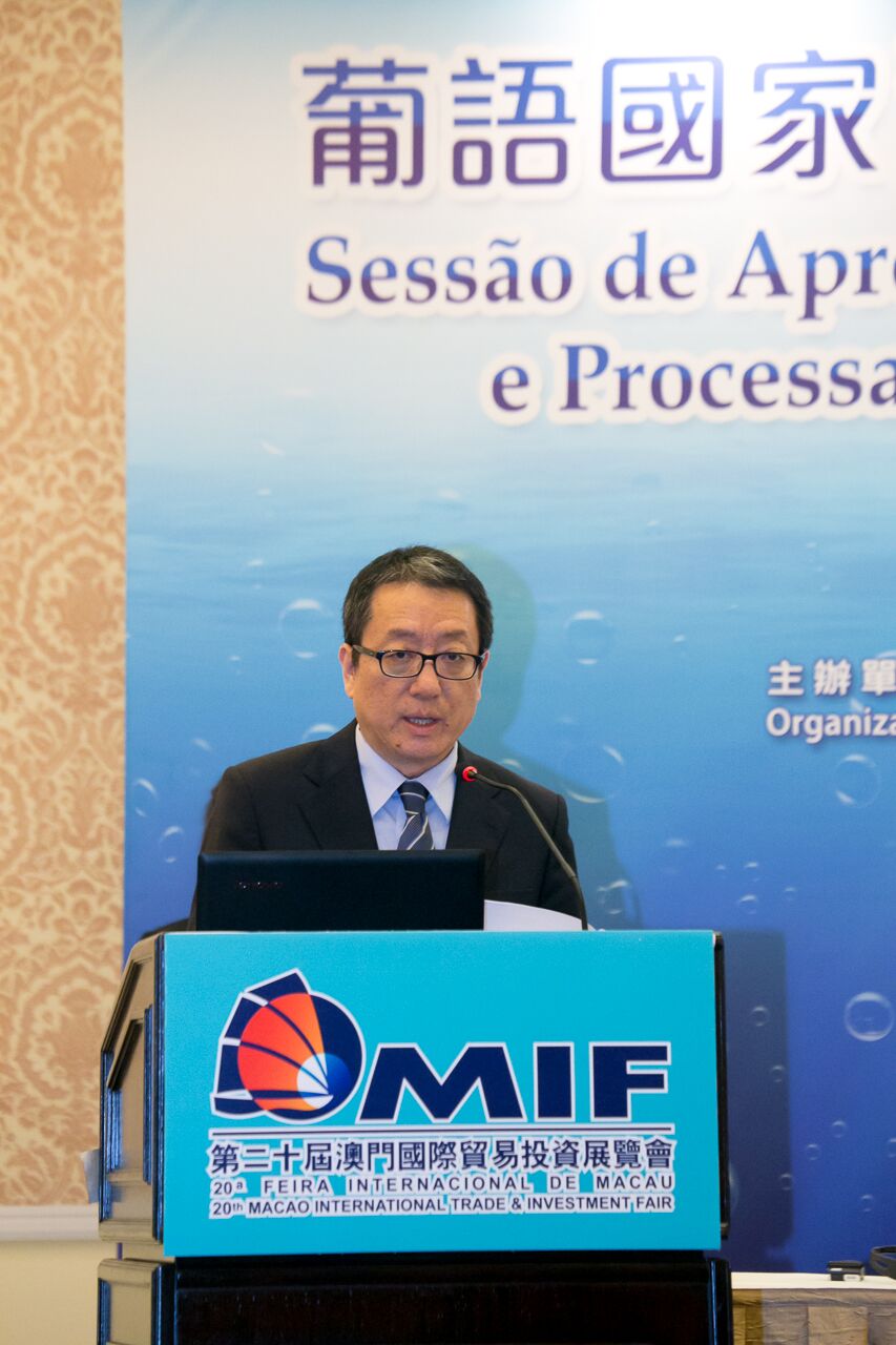 中葡論壇(澳門)常設秘書處常和喜秘書長、中央駐澳門特區聯絡辦公室經濟部陳星副部長兼貿易處負責人、中國外交部駐澳門特派員公署綜合部汪元副主任、澳門貿易投資促進局吳愛華執行委員、安哥拉共和國漁業部廳長Nelson Samuel、巴西外交部外交官Daniel Costa Figueiredo、幾內亞比紹漁業及資源部部長經濟顧問António Domingos Tubento、莫桑比克國家漁業局局長Simeão Lopes、代表中葡論壇派駐代表及葡萄牙經貿投資促進局貿易投資官員Manuela Ferreira Dias及東帝汶農業及漁業部漁業局局長Acacio Guterres等嘉賓出席推介會, 常和喜秘書長致歡迎辭。