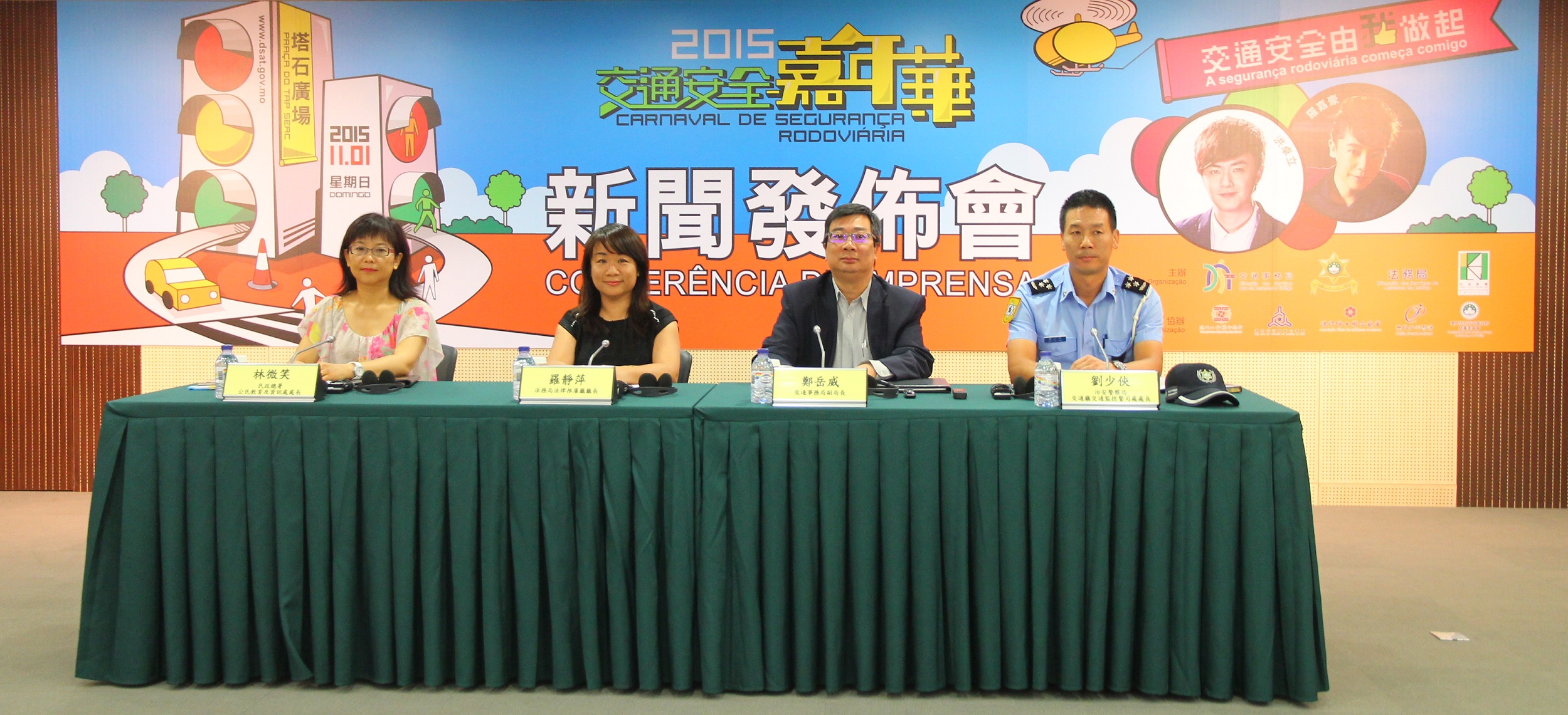 交通事務局副局長鄭岳威、法務局法律推廣廳廳長羅靜萍、治安警察局交通廳劉少俠警司,以及民政總署公民教育及資訊處處長林微笑,今日(27日)下午於交通事務局多功能廳召開新聞發佈會,介紹今年交通安全推廣一系列重點活動的詳情。