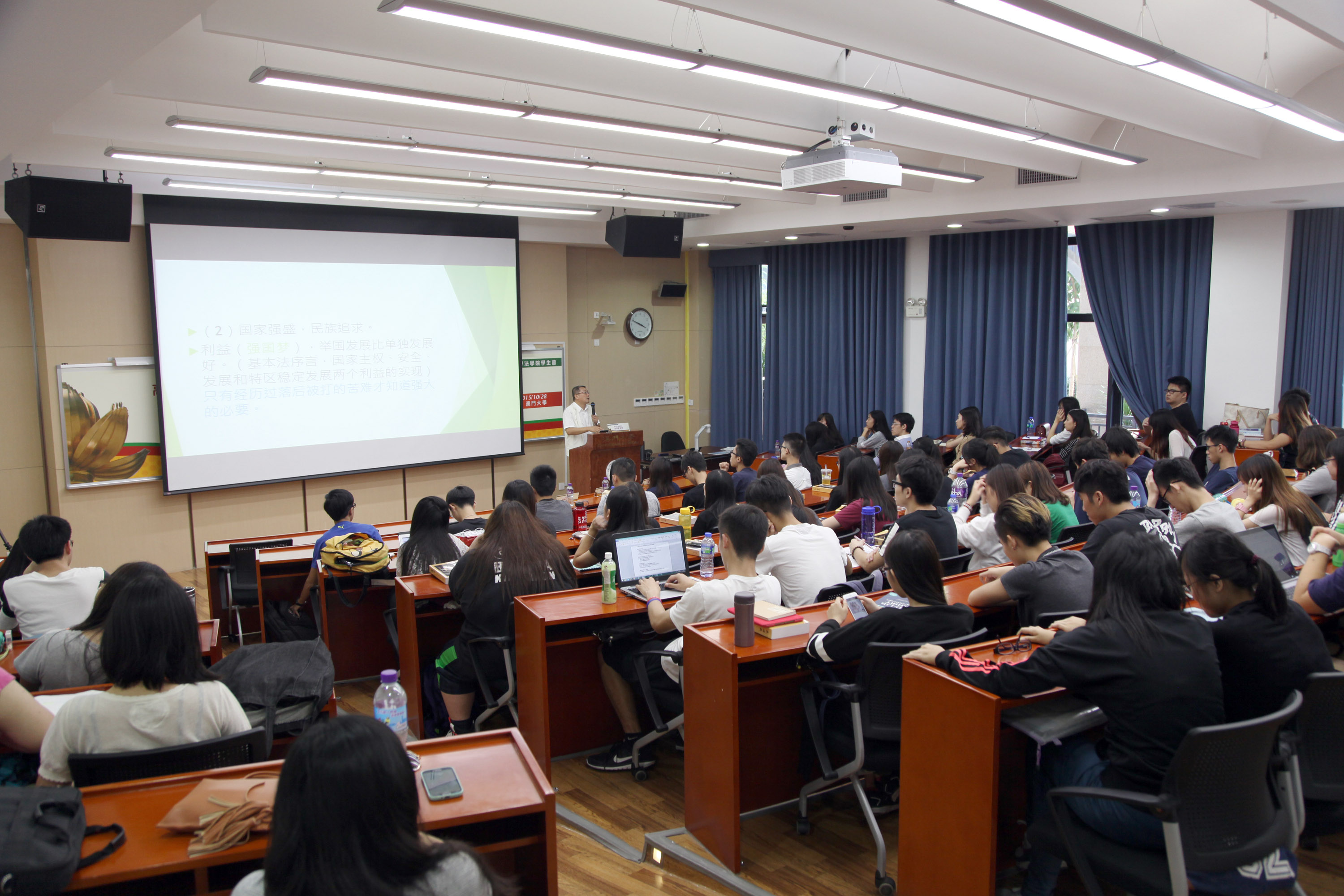 為了加強在高等院校推廣介紹憲法與基本法,讓學生深入理解憲法與基本法的關係,正確認識“一國兩制”的深層意義。法務局今年開始,計劃與本澳多所高等院校合作,舉辦憲法與基本法專題講座及“國是茶聊”小型法律討論會。首場專題講座於昨天(28日)在澳門大學舉行,由澳門大學法學院教授駱偉建主講,就專題內容向出席的學生進行了深入的講解。法務局代局長梁葆瑩、澳門大學法學院院長莫世健、副教授邱庭彪,以及不同學系及年級的學生出席了講座。